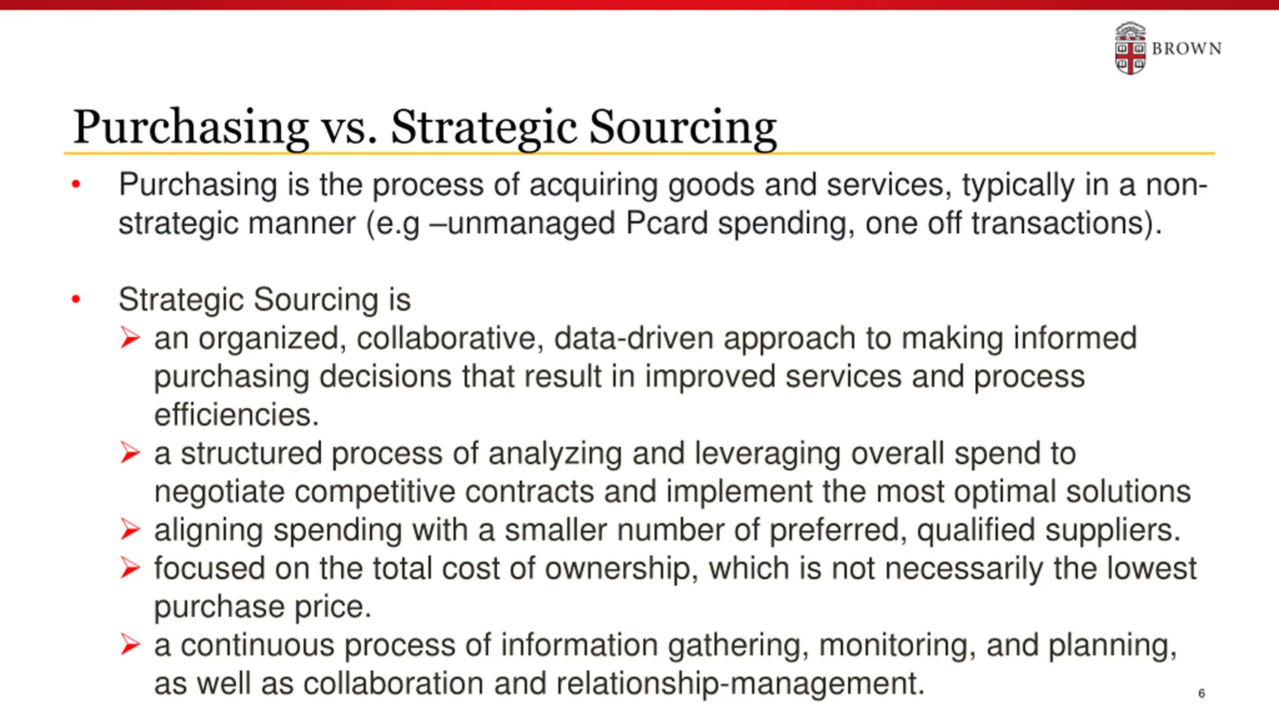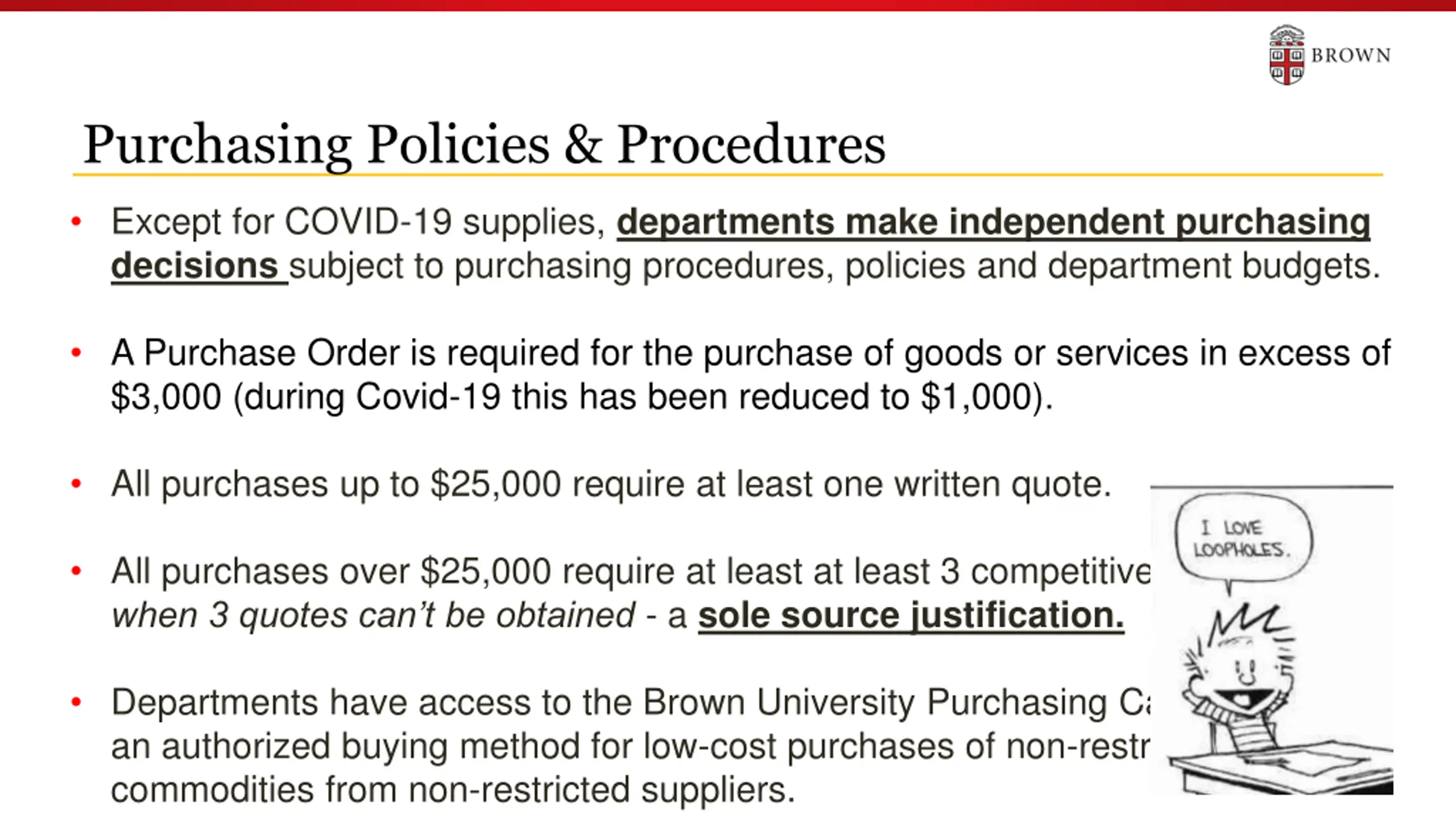 Purchasing Policies & Procedures Except for COVID-19 supplies, departments make independent purchasing decisions subject to purchasing procedures, policies and department budgets. A Purchase Order is required for the purchase of goods or services in excess of $3,000 (during Covid-19 this has been reduced to $1,000). All purchases up to $25,000 require at least one written quote. All purchases over $25,000 require at least at least 3 competitive quotes or - when 3 quotes can t be obtained - a sole source justification. Departments have access to the Brown University Purchasing Card (PCard), an authorized buying method for low-cost purchases of non-restricted commodities from non-restricted suppliers. 5