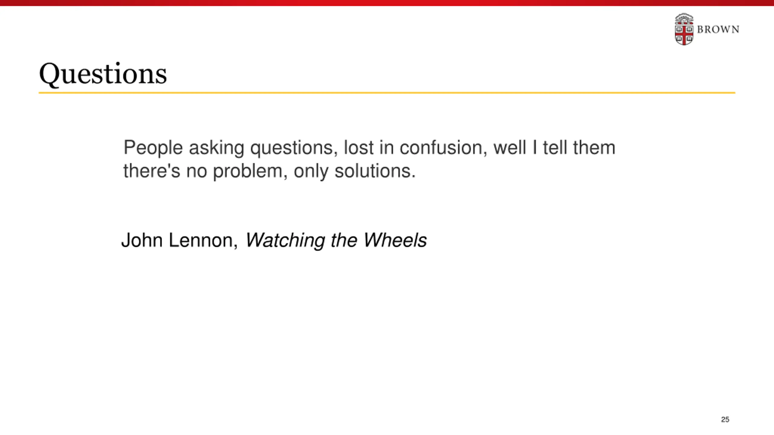Questions People asking questions, lost in confusion, well I tell them there's no problem, only solutions. John Lennon, Watching the Wheels 25