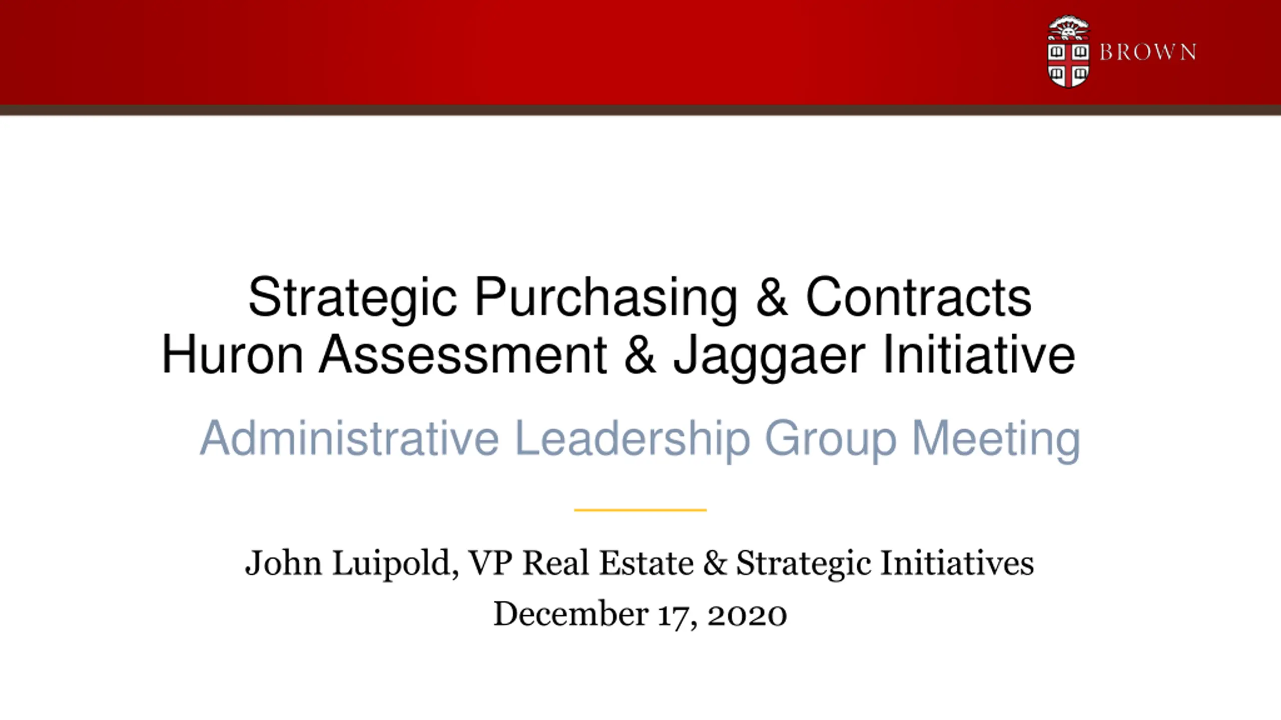 Strategic Purchasing & Contracts Huron Assessment & Jaggaer Initiative Administrative Leadership Group Meeting John Luipold, VP Real Estate & Strategic Initiatives December 17, 2020