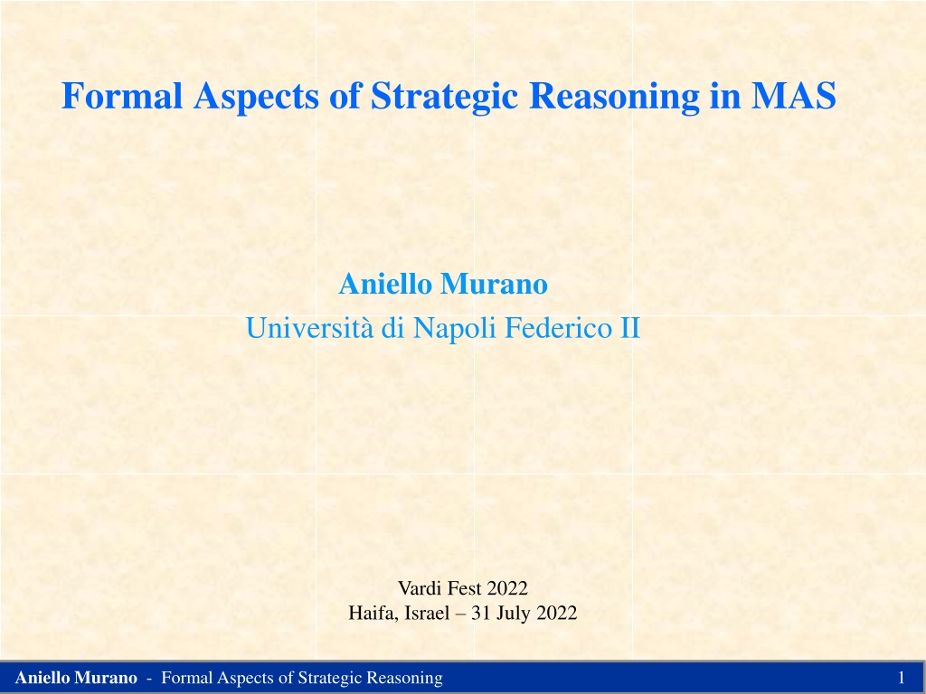 Formal Aspects of Strategic Reasoning in MAS Aniello Murano Universit di Napoli Federico II Vardi Fest 2022 Haifa, Israel 31 July 2022 Aniello Murano - FormalAspects of Strategic Reasoning 1