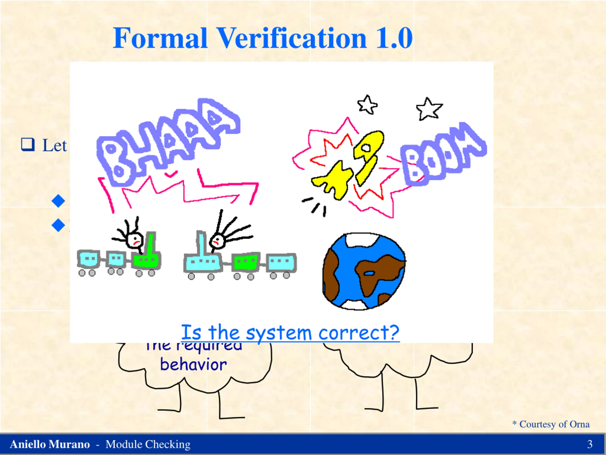 Formal Verification 1.0 Model Checking Let S be a finite-state system and P its desired behavior S P labelled state-transition graph M a temporal logic formula The system has the required behavior Is the system correct? M satisfies * Courtesy of Orna Aniello Murano - Module Checking 3