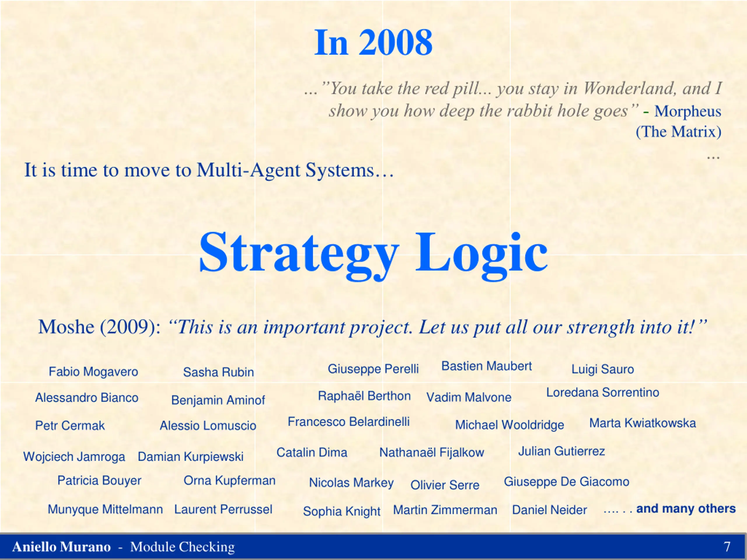 In 2008 You take the red pill... you stay in Wonderland, and I show you how deep the rabbit hole goes Morpheus (The Matrix) It is time to move to Multi-Agent Systems Strategy Logic Moshe (2009): This is an important project. Let us put all our strength into it! Bastien Maubert Giuseppe Perelli Luigi Sauro Fabio Mogavero Sasha Rubin Loredana Sorrentino Rapha l Berthon Vadim Malvone Alessandro Bianco Benjamin Aminof Francesco Belardinelli Marta Kwiatkowska Michael Wooldridge Petr Cermak Alessio Lomuscio Julian Gutierrez Catalin Dima Nathana l Fijalkow Wojciech Jamroga Damian Kurpiewski Patricia Bouyer Orna Kupferman Giuseppe De Giacomo Nicolas Markey Olivier Serre . . . and many others Munyque Mittelmann Laurent Perrussel Martin Zimmerman Daniel Neider Sophia Knight Aniello Murano - Module Checking 7