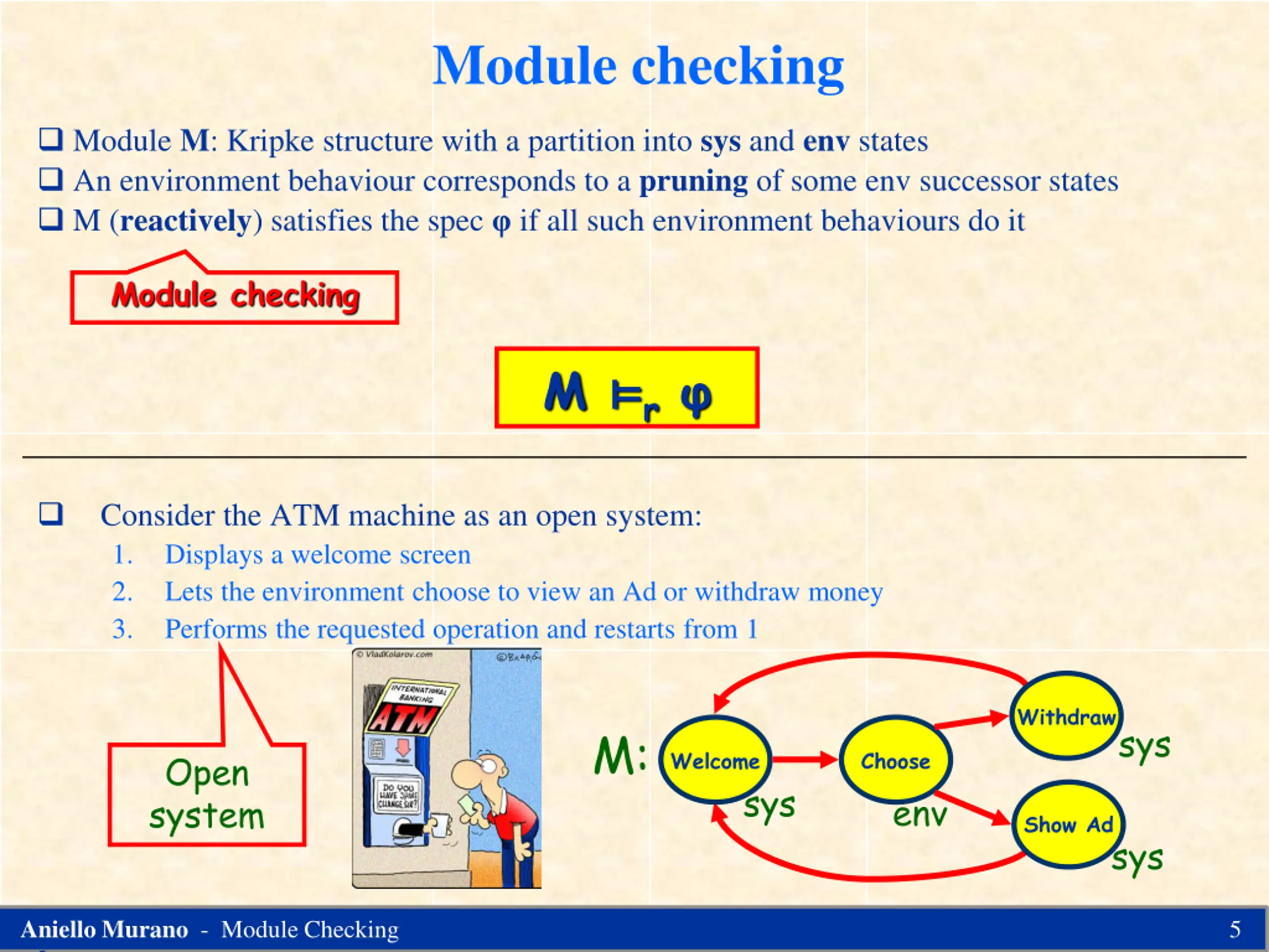 Module checking Module M: Kripke structure with a partition into sys and env states An environment behaviour corresponds to a pruning of some env successor states M (reactively) satisfies the spec if all such environment behaviours do it Module checking M r Consider the ATM machine as an open system: 1. Displays a welcome screen 2. Lets the environment choose to view an Ad or withdraw money 3. Performs the requested operation and restarts from 1 Withdraw sys M: Welcome Choose env Open system sys Show Ad sys Aniello Murano - Module Checking 5