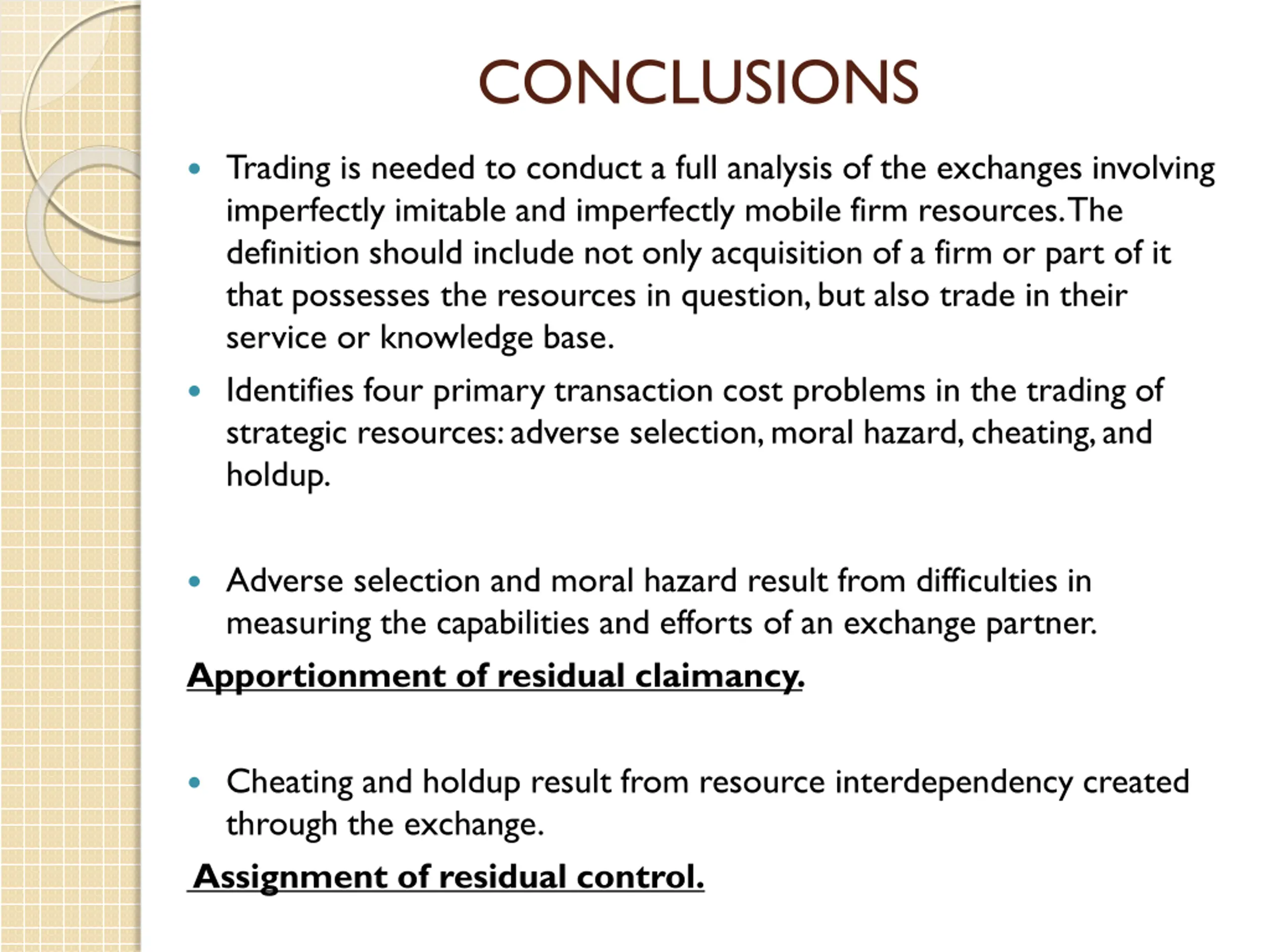 CONCLUSIONS Trading is needed to conduct a full analysis of the exchanges involving imperfectly imitable and imperfectly mobile firm resources. The definition should include not only acquisition of a firm or part of it that possesses the resources in question, but also trade in their service or knowledge base. Identifies four primary transaction cost problems in the trading of strategic resources: adverse selection, moral hazard, cheating, and holdup. Adverse selection and moral hazard result from difficulties in measuring the capabilities and efforts of an exchange partner. Apportionment of residual claimancy. Cheating and holdup result from resource interdependency created through the exchange. Assignment of residual control.