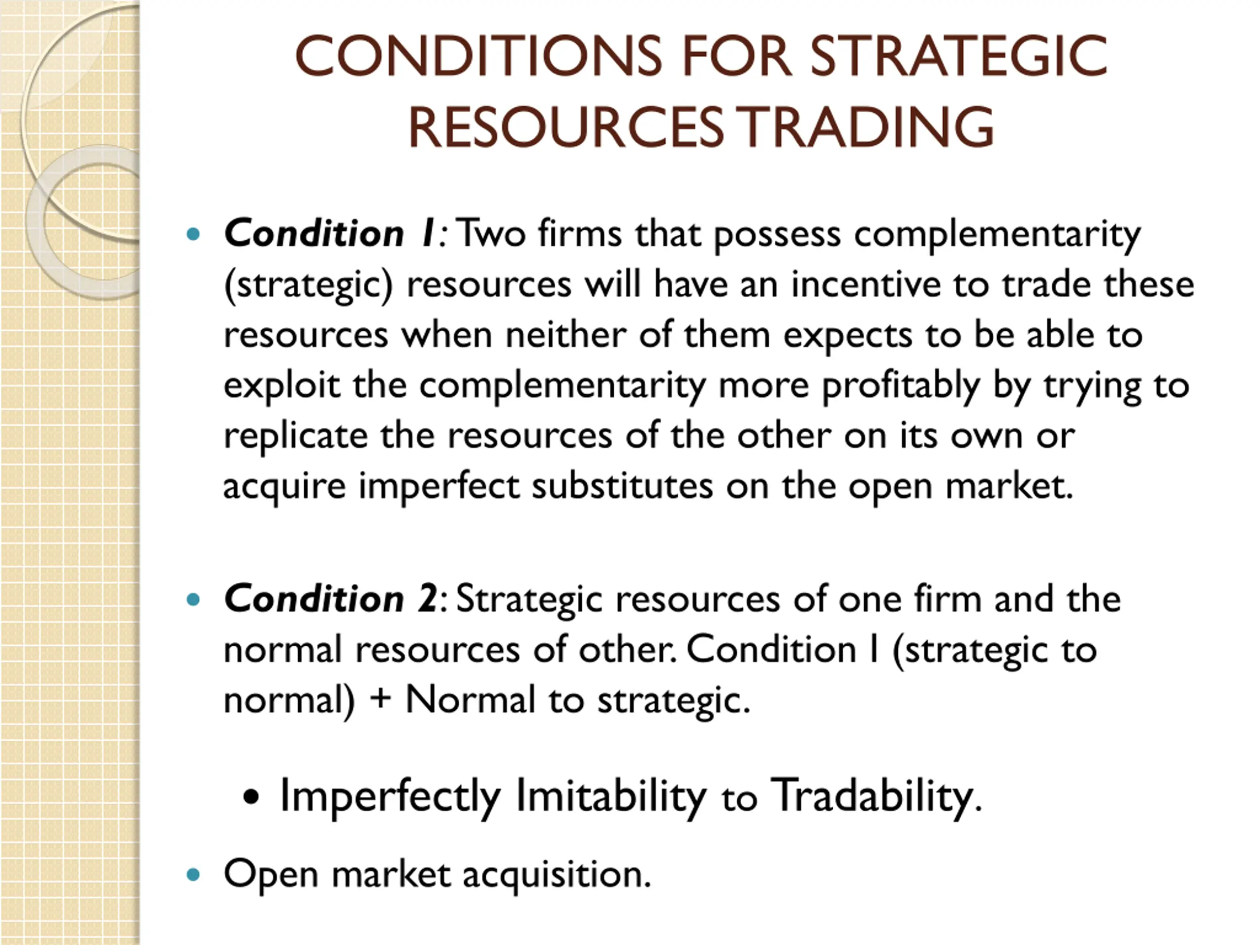 CONDITIONS FOR STRATEGIC RESOURCES TRADING Condition 1: Two firms that possess complementarity (strategic) resources will have an incentive to trade these resources when neither of them expects to be able to exploit the complementarity more profitably by trying to replicate the resources of the other on its own or acquire imperfect substitutes on the open market. Condition 2: Strategic resources of one firm and the normal resources of other. Condition I (strategic to normal) + Normal to strategic. Imperfectly Imitability to Tradability. Open market acquisition.