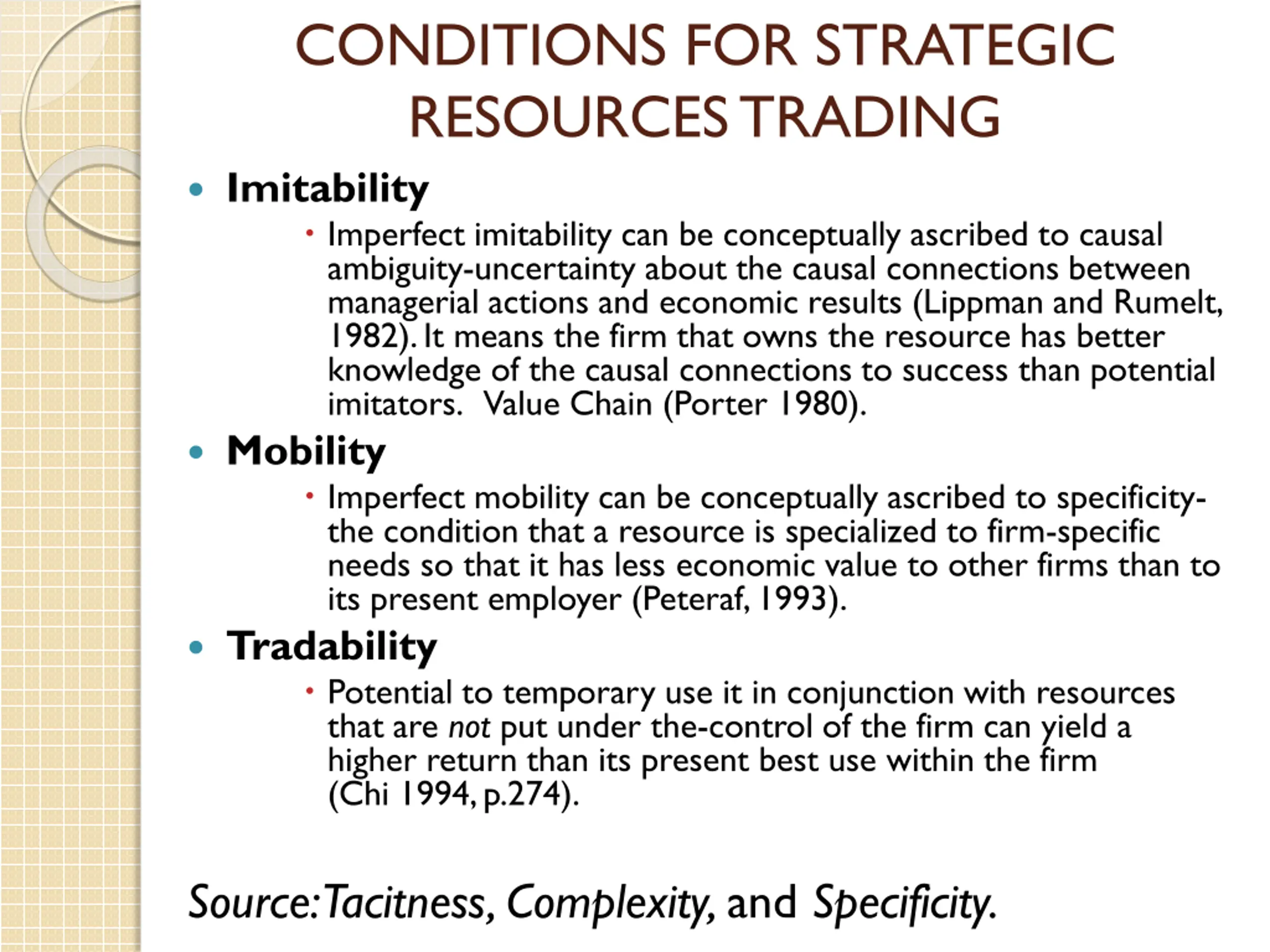 CONDITIONS FOR STRATEGIC RESOURCES TRADING Imitability Imperfect imitability can be conceptually ascribed to causal ambiguity-uncertainty about the causal connections between managerial actions and economic results (Lippman and Rumelt, 1982). It means the firm that owns the resource has better knowledge of the causal connections to success than potential imitators. Value Chain (Porter 1980). Mobility Imperfect mobility can be conceptually ascribed to specificity- the condition that a resource is specialized to firm-specific needs so that it has less economic value to other firms than to its present employer (Peteraf, 1993). Tradability Potential to temporary use it in conjunction with resources that are not put under the-control of the firm can yield a higher return than its present best use within the firm (Chi 1994, p.274). Source: Tacitness, Complexity, and Specificity.