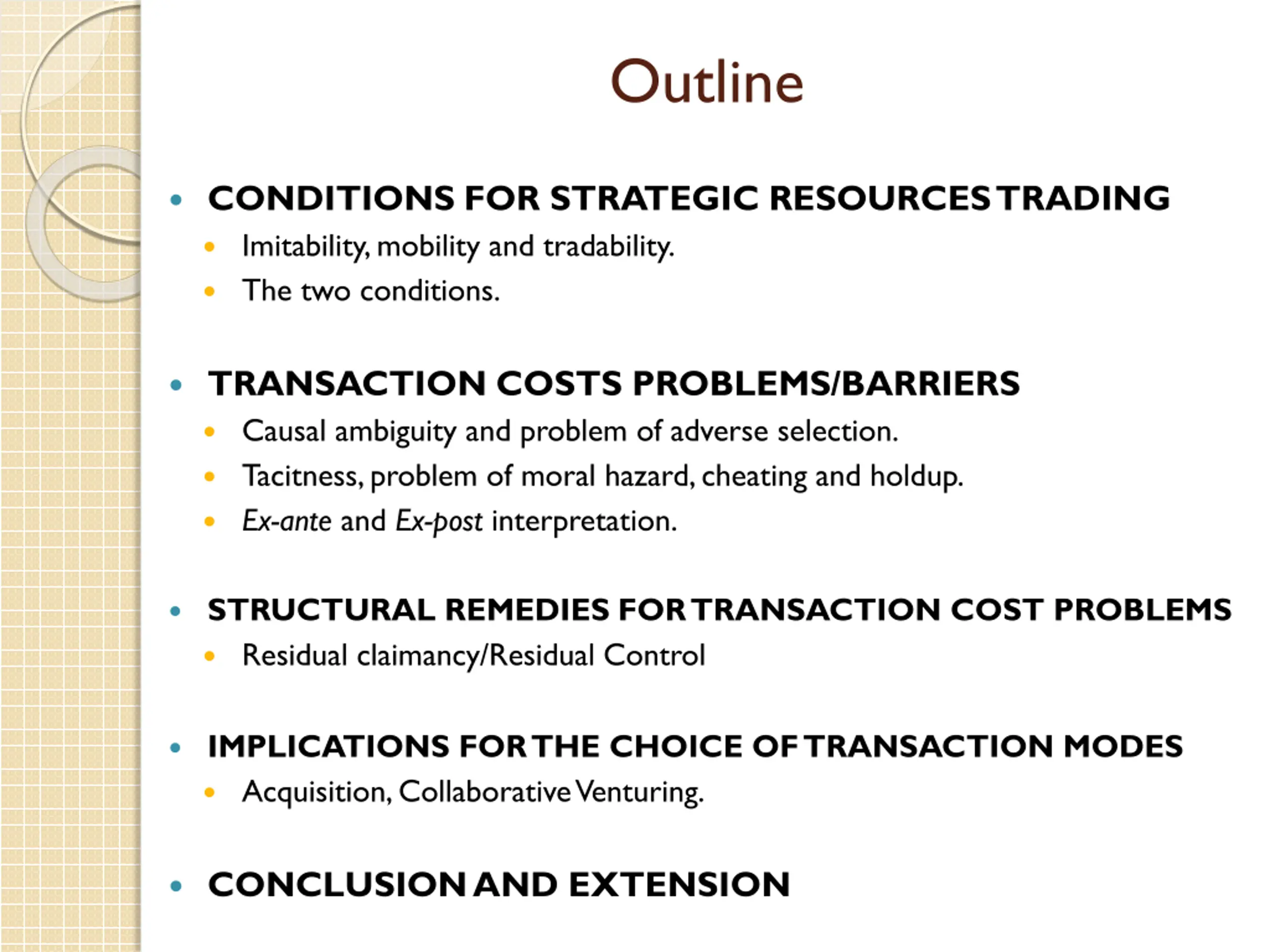 Outline CONDITIONS FOR STRATEGIC RESOURCES TRADING Imitability, mobility and tradability. The two conditions. TRANSACTION COSTS PROBLEMS/BARRIERS Causal ambiguity and problem of adverse selection. Tacitness, problem of moral hazard, cheating and holdup. Ex-ante and Ex-post interpretation. STRUCTURAL REMEDIES FOR TRANSACTION COST PROBLEMS Residual claimancy/Residual Control IMPLICATIONS FOR THE CHOICE OF TRANSACTION MODES Acquisition, Collaborative Venturing. CONCLUSION AND EXTENSION