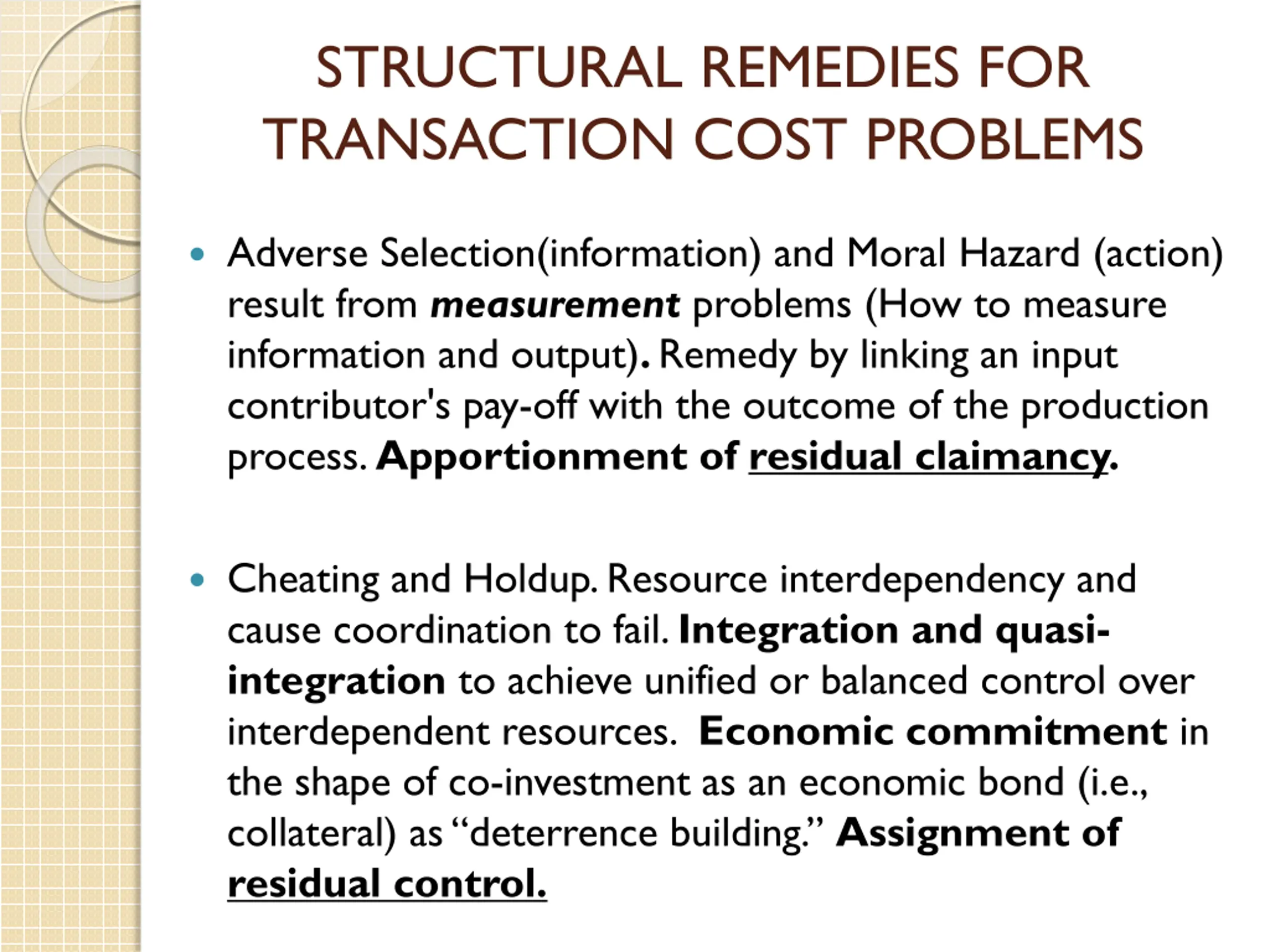 STRUCTURAL REMEDIES FOR TRANSACTION COST PROBLEMS Adverse Selection(information) and Moral Hazard (action) result from measurement problems (How to measure information and output). Remedy by linking an input contributor's pay-off with the outcome of the production process. Apportionment of residual claimancy. Cheating and Holdup. Resource interdependency and cause coordination to fail. Integration and quasi- integration to achieve unified or balanced control over interdependent resources. Economic commitment in the shape of co-investment as an economic bond (i.e., collateral) as deterrence building. Assignment of residual control.