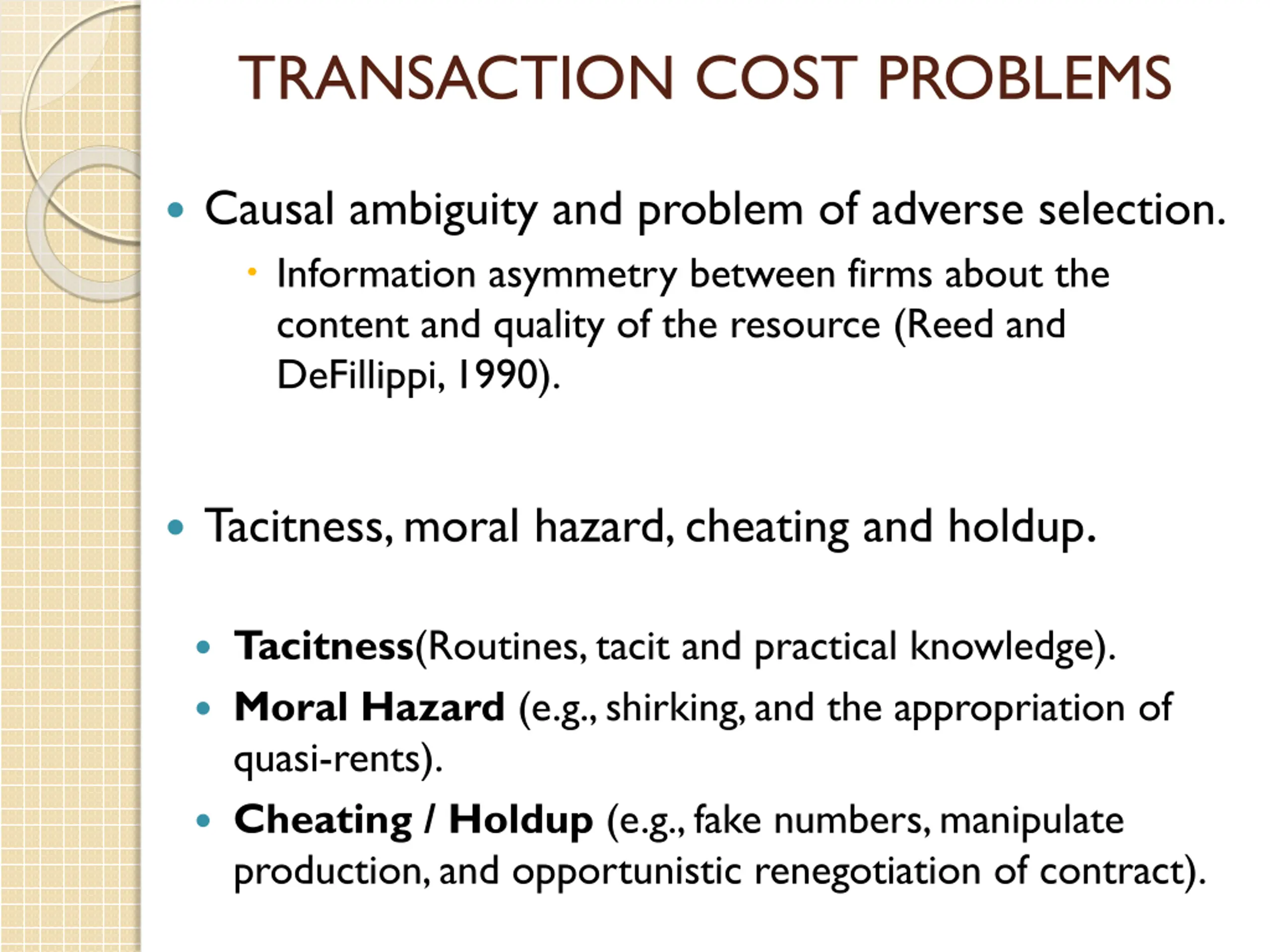 TRANSACTION COST PROBLEMS Causal ambiguity and problem of adverse selection. Information asymmetry between firms about the content and quality of the resource (Reed and DeFillippi, 1990). Tacitness, moral hazard, cheating and holdup. Tacitness(Routines, tacit and practical knowledge). Moral Hazard (e.g., shirking, and the appropriation of quasi-rents). Cheating / Holdup (e.g., fake numbers, manipulate production, and opportunistic renegotiation of contract).