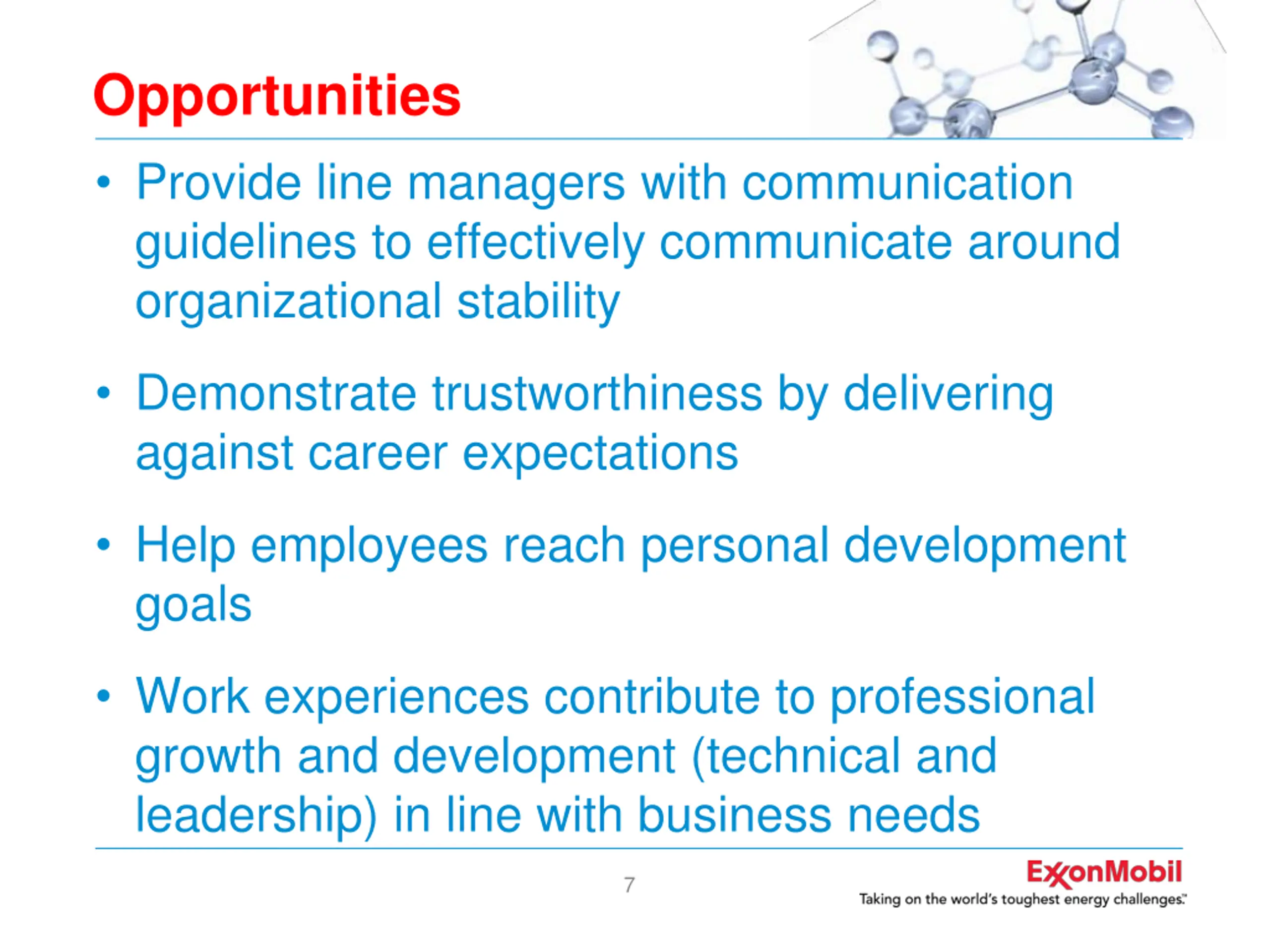 Opportunities Provide line managers with communication guidelines to effectively communicate around organizational stability Demonstrate trustworthiness by delivering against career expectations Help employees reach personal development goals Work experiences contribute to professional growth and development (technical and leadership) in line with business needs 7