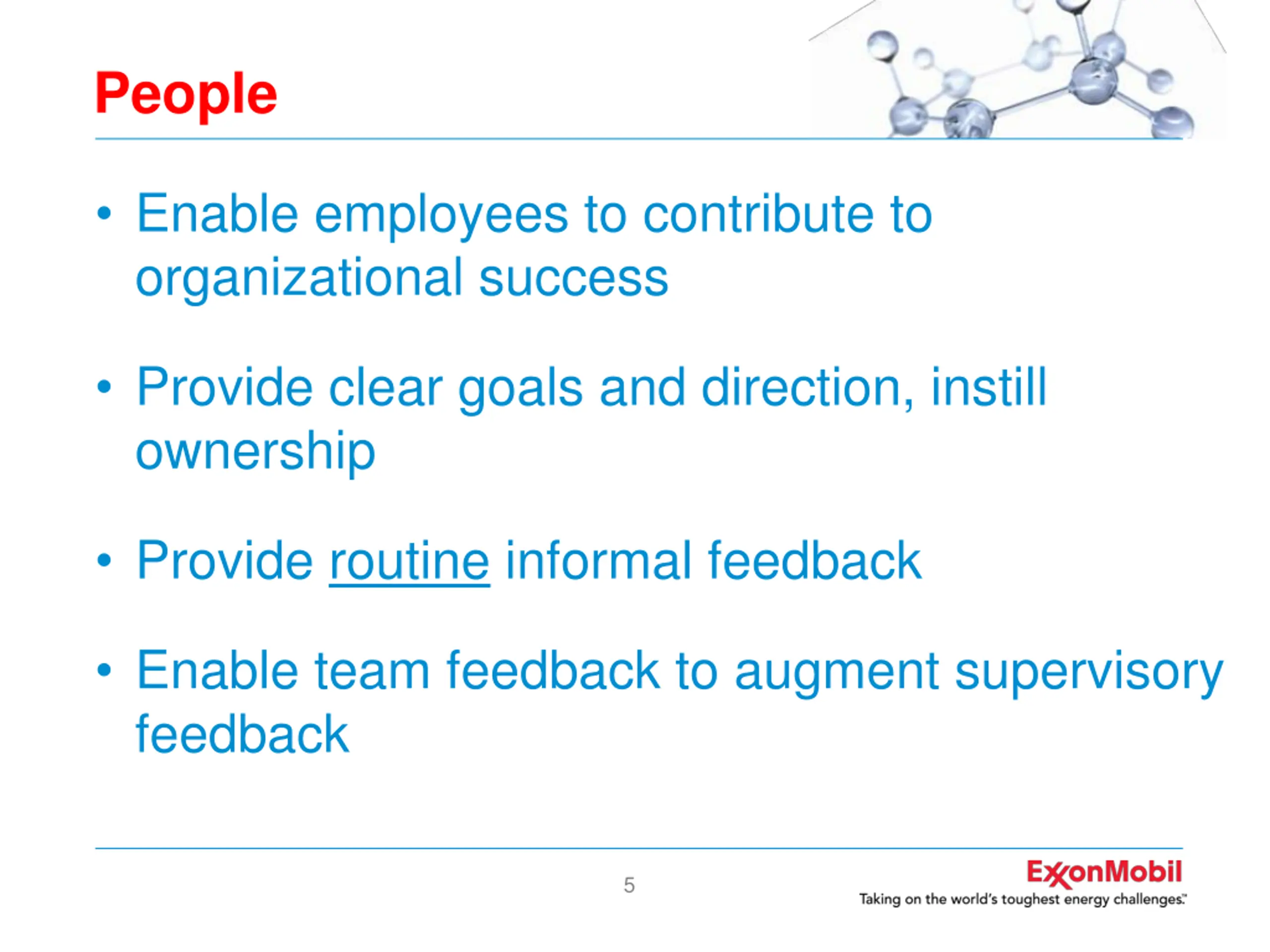 People Enable employees to contribute to organizational success Provide clear goals and direction, instill ownership Provide routine informal feedback Enable team feedback to augment supervisory feedback 5