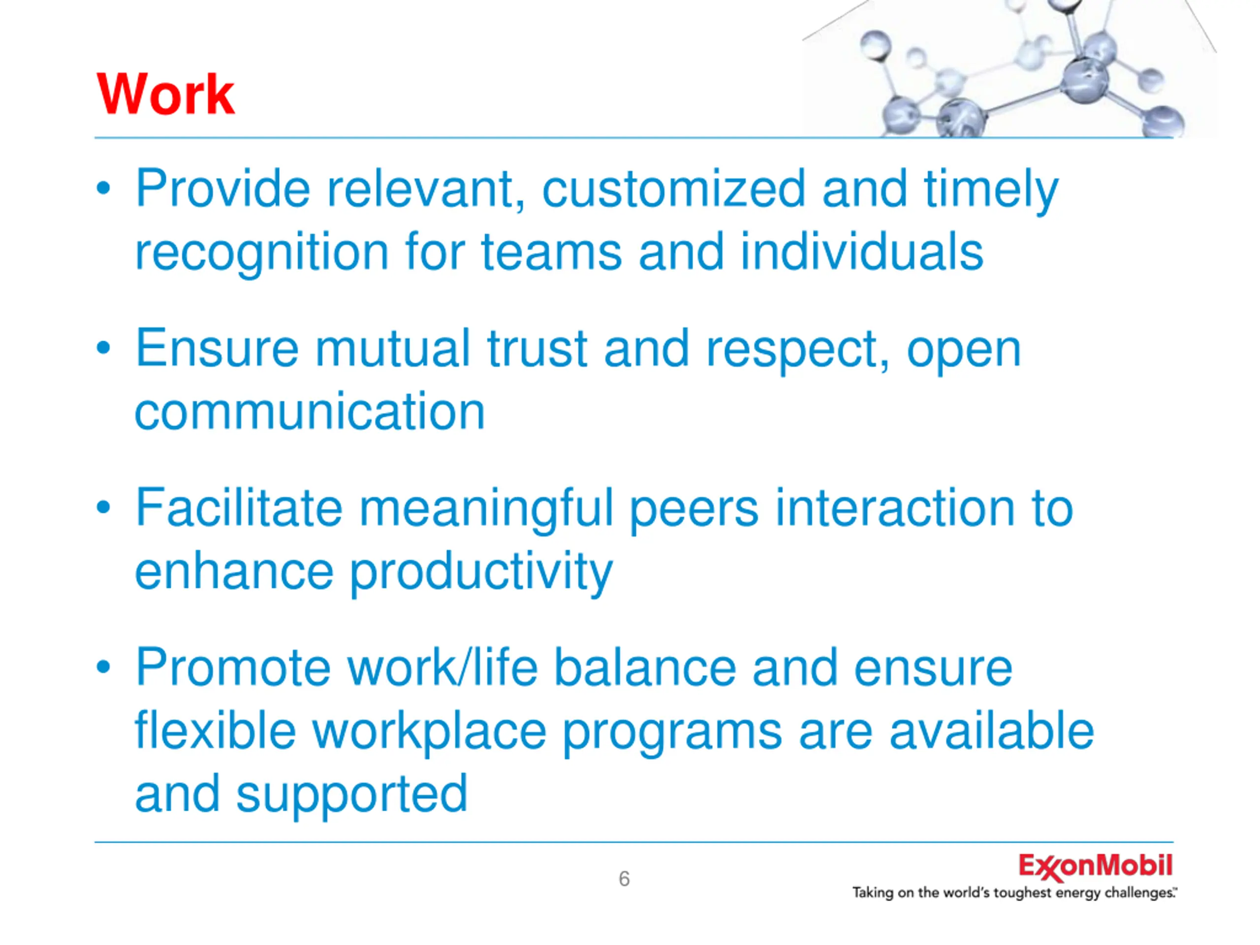 Work Provide relevant, customized and timely recognition for teams and individuals Ensure mutual trust and respect, open communication Facilitate meaningful peers interaction to enhance productivity Promote work/life balance and ensure flexible workplace programs are available and supported 6