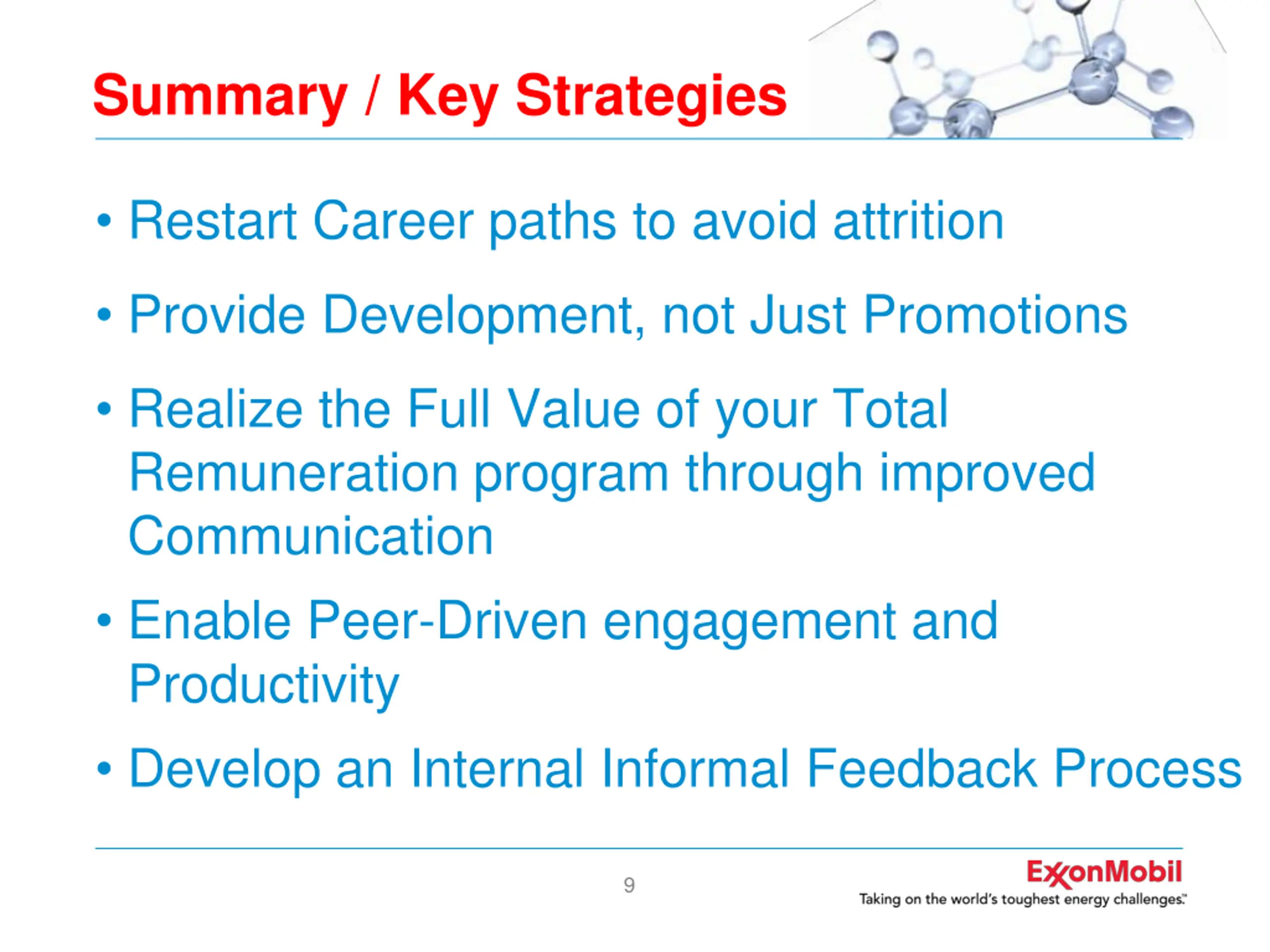 Summary / Key Strategies Restart Career paths to avoid attrition Provide Development, not Just Promotions Realize the Full Value of your Total Remuneration program through improved Communication Enable Peer-Driven engagement and Productivity Develop an Internal Informal Feedback Process 9