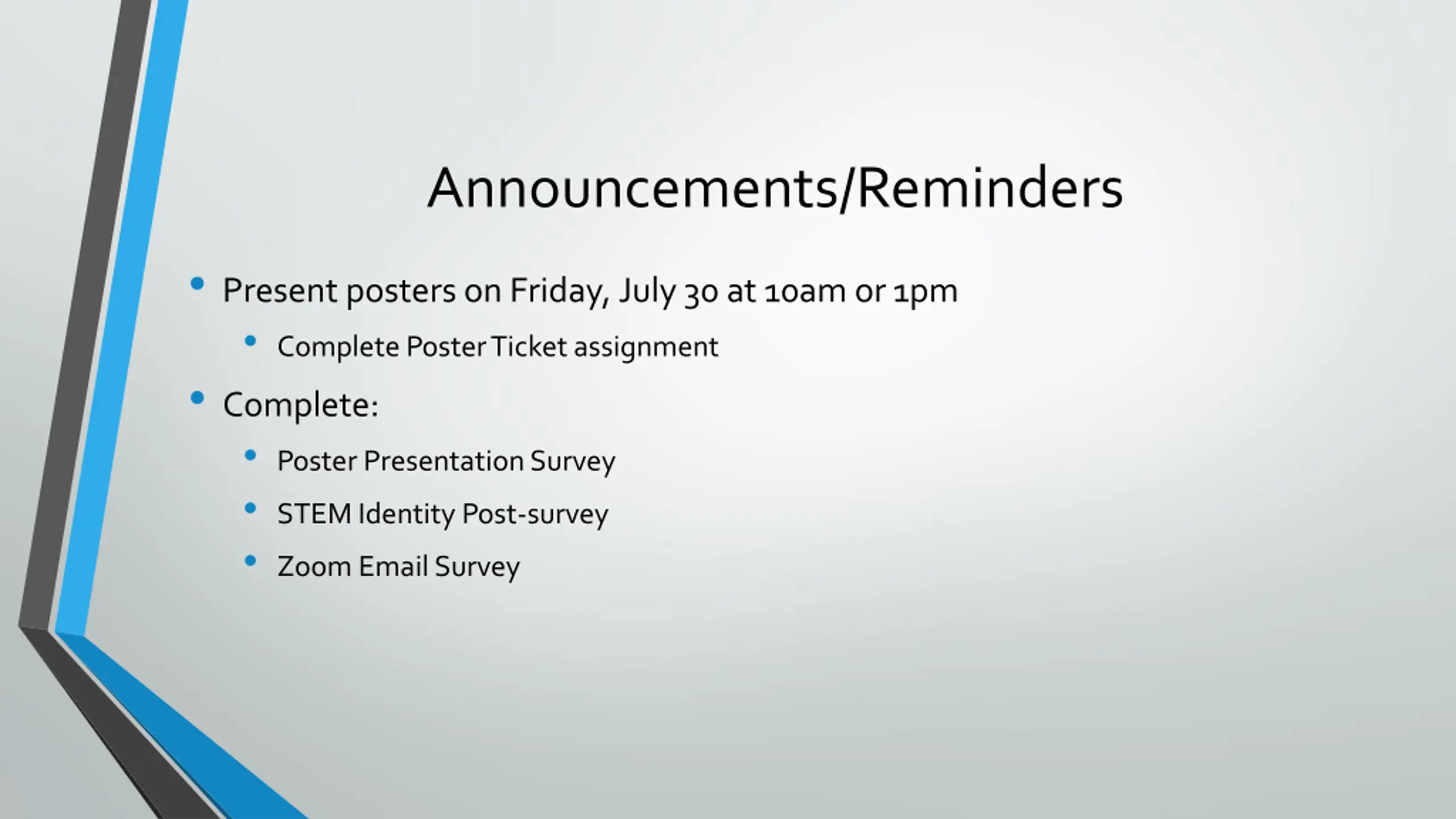 Announcements/Reminders Present posters on Friday, July 30 at 10am or 1pm Complete Poster Ticket assignment Complete: Poster Presentation Survey STEM Identity Post-survey Zoom Email Survey