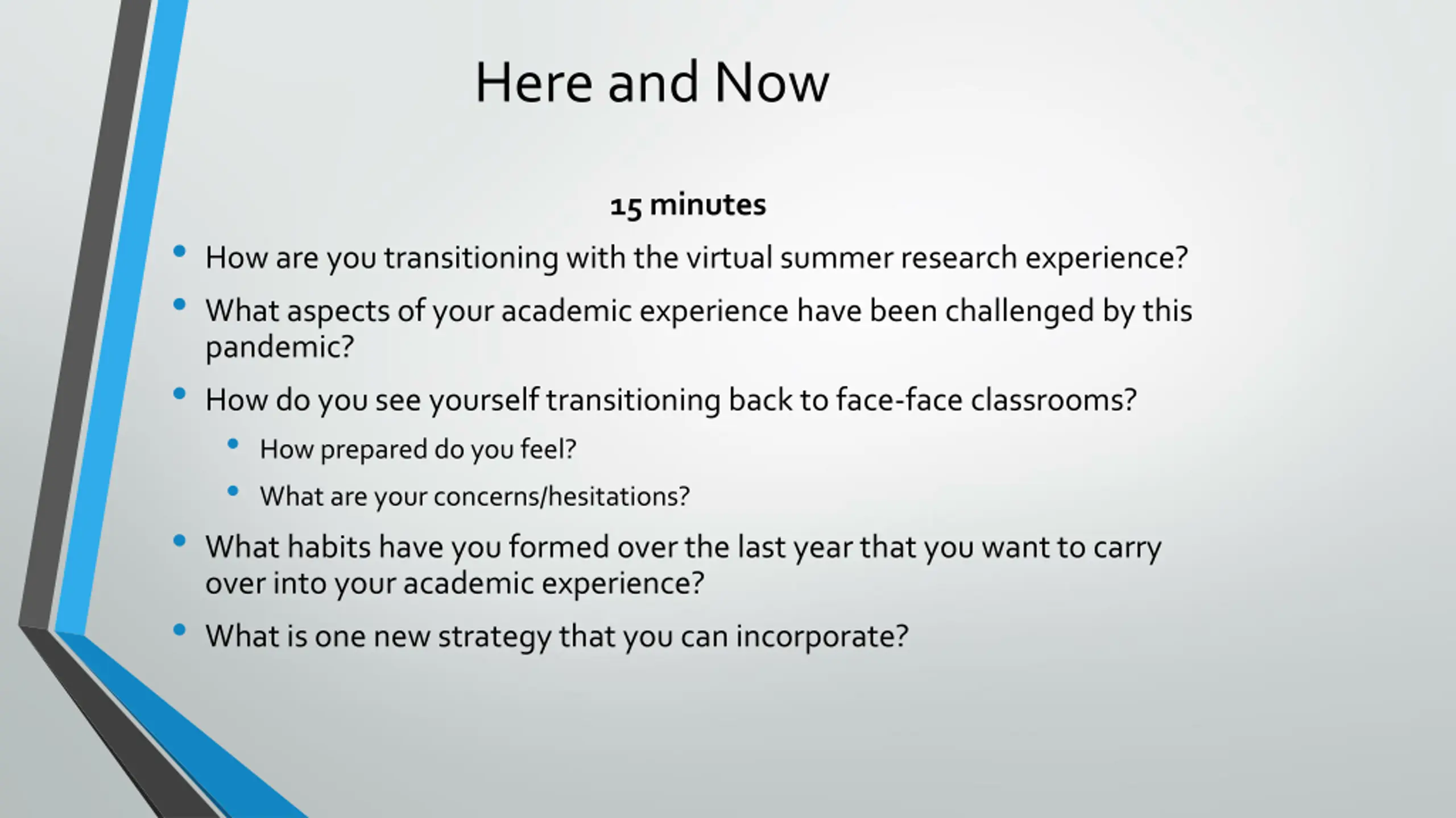 Here and Now 15 minutes How are you transitioning with the virtual summer research experience? What aspects of your academic experience have been challenged by this pandemic? How do you see yourself transitioning back to face-face classrooms? How prepared do you feel? What are your concerns/hesitations? What habits have you formed over the last year that you want to carry over into your academic experience? What is one new strategy that you can incorporate?