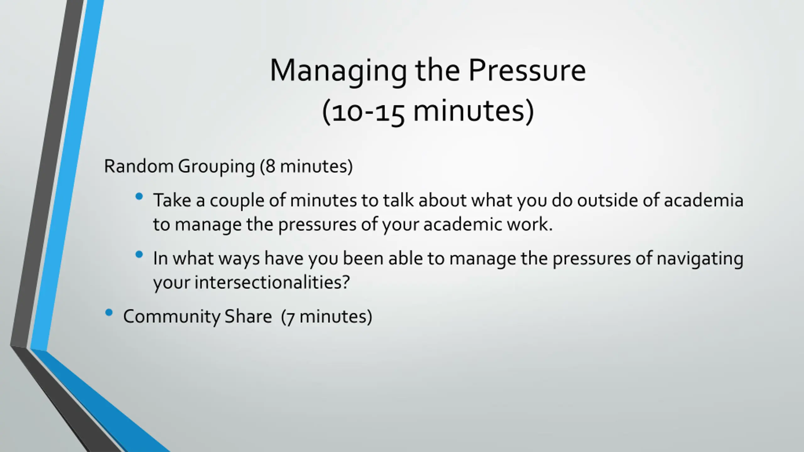 Managing the Pressure (10-15 minutes) Random Grouping (8 minutes) Take a couple of minutes to talk about what you do outside of academia to manage the pressures of your academic work. In what ways have you been able to manage the pressures of navigating your intersectionalities? Community Share (7 minutes)