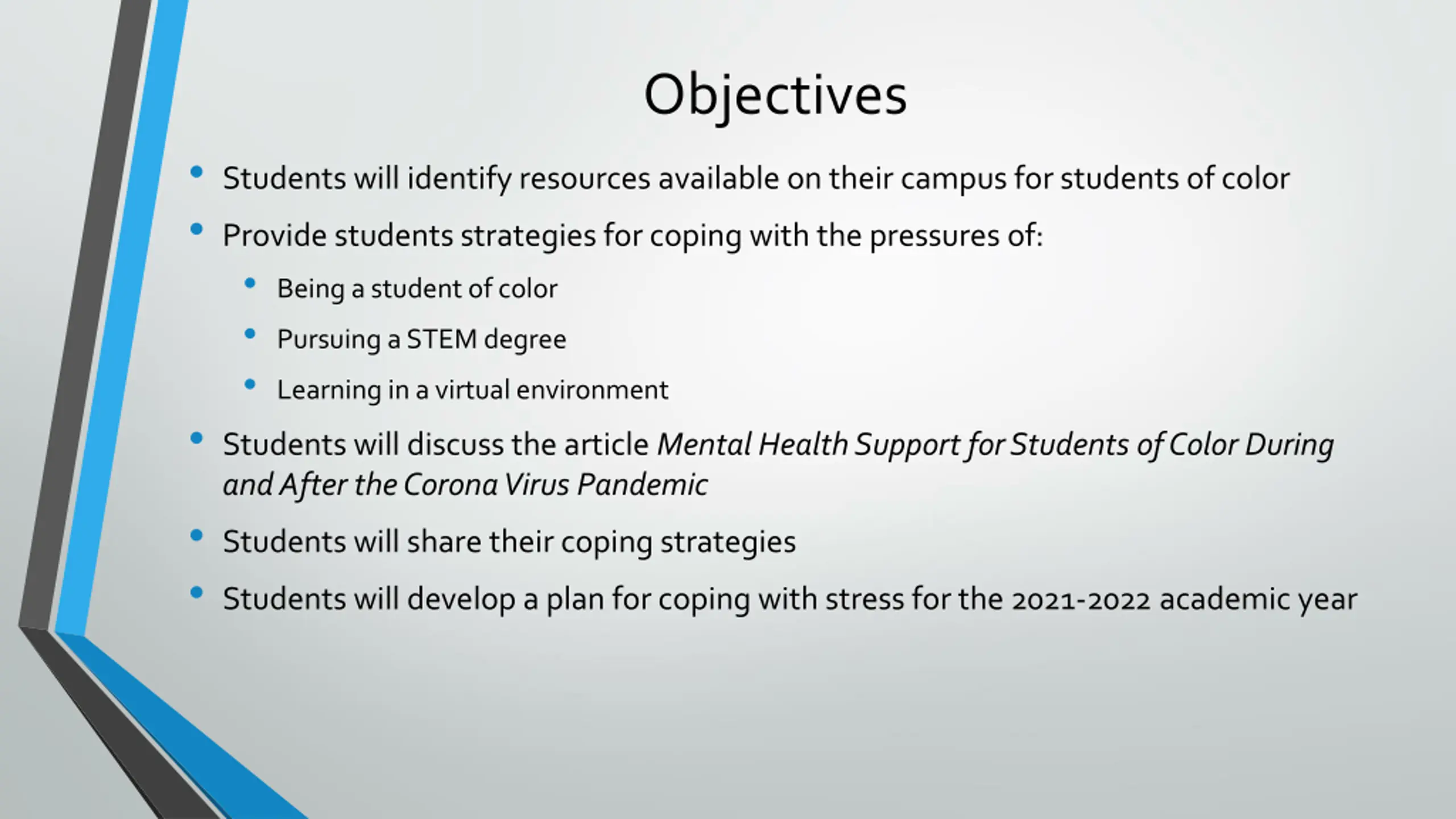 Objectives Students will identify resources available on their campus for students of color Provide students strategies for coping with the pressures of: Being a student of color Pursuing a STEM degree Learning in a virtual environment Students will discuss the article Mental Health Support for Students of Color During and After the Corona Virus Pandemic Students will share their coping strategies Students will develop a plan for coping with stress for the 2021-2022 academic year
