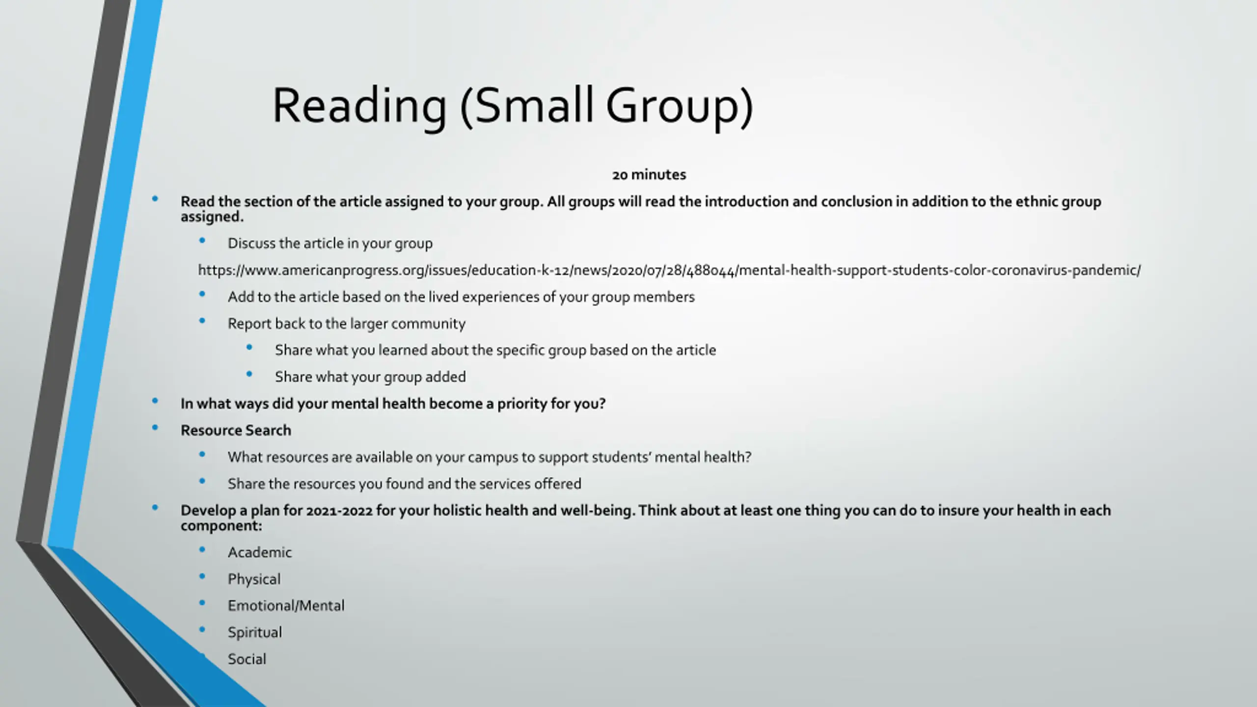 Reading (Small Group) 20 minutes Read the section of the article assigned to your group. All groups will read the introduction and conclusion in addition to the ethnic group assigned. Discuss the article in your group https://www.americanprogress.org/issues/education-k-12/news/2020/07/28/488044/mental-health-support-students-color-coronavirus-pandemic/ Add to the article based on the lived experiences of your group members Report back to the larger community Share what you learned about the specific group based on the article Share what your group added In what ways did your mental health become a priority for you? Resource Search What resources are available on your campus to support students mental health? Share the resources you found and the services offered Develop a plan for 2021-2022 for your holistic health and well-being. Think about at least one thing you can do to insure your health in each component: Academic Physical Emotional/Mental Spiritual Social