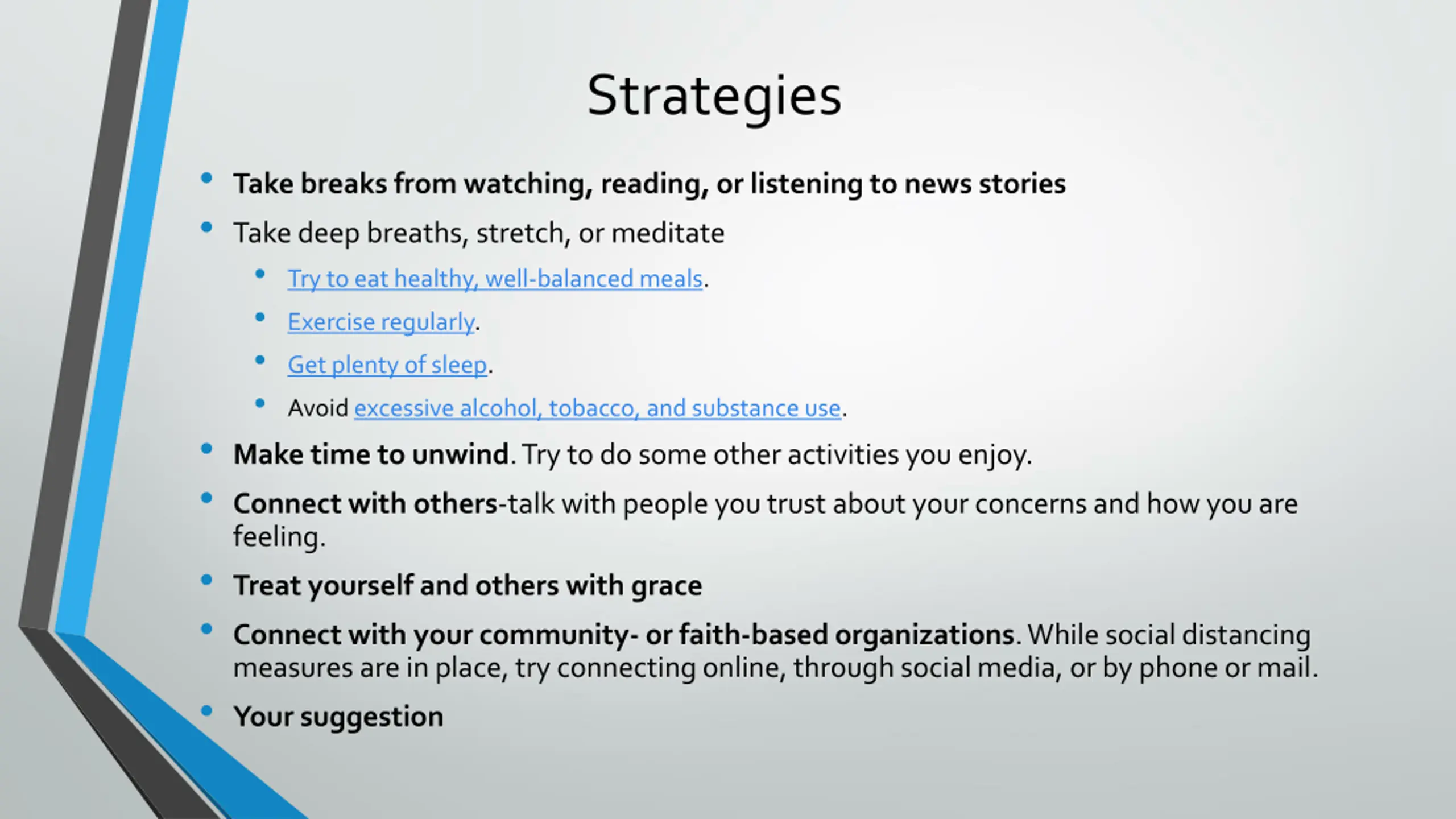 Strategies Take breaks from watching, reading, or listening to news stories Take deep breaths, stretch, or meditate Try to eat healthy, well-balanced meals. Exercise regularly. Get plenty of sleep. Avoidexcessive alcohol, tobacco, and substance use. Make time to unwind. Try to do some other activities you enjoy. Connect with others-talk with peopleyou trust about your concerns and how you are feeling. Treat yourself and others with grace Connect with your community- or faith-based organizations. While social distancing measures are in place, try connecting online, through social media, or by phone or mail. Your suggestion