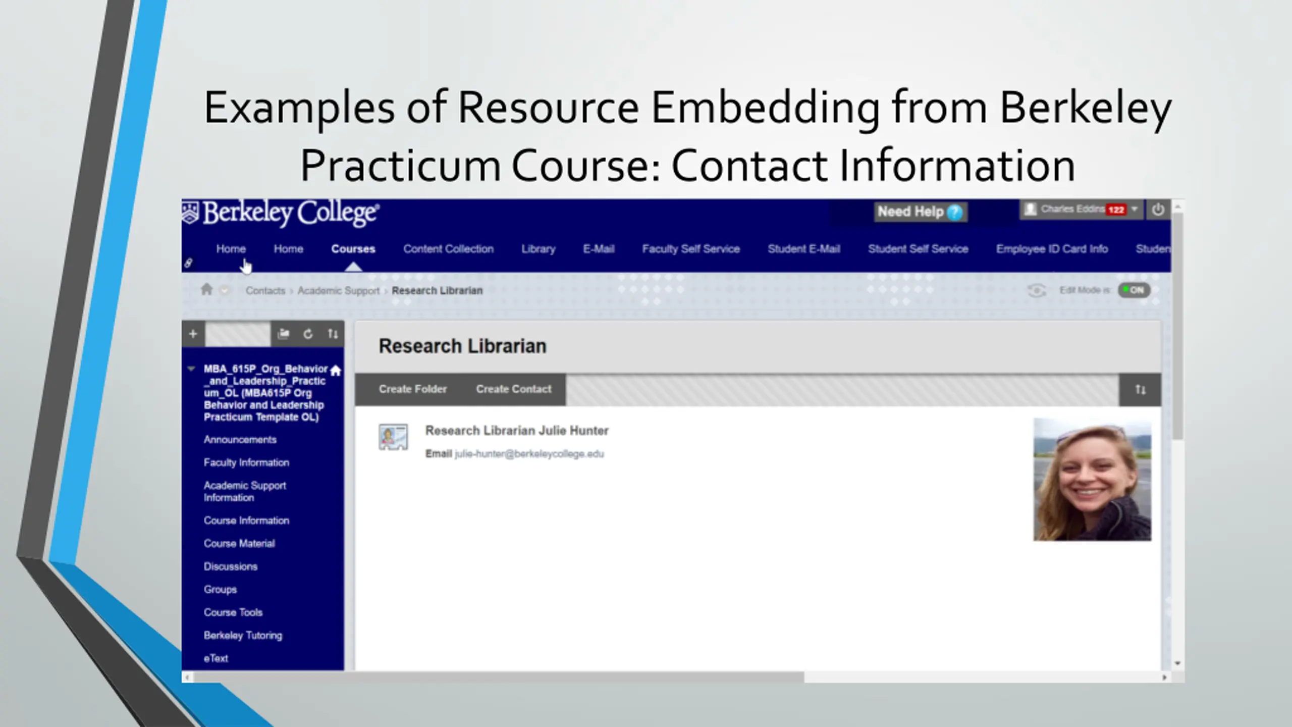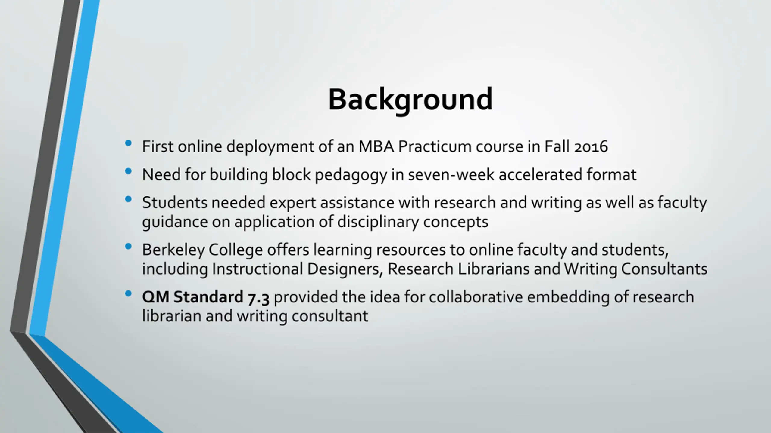 Background First online deployment of an MBA Practicum course in Fall 2016 Need for building block pedagogy in seven-week accelerated format Students needed expert assistance with research and writing as well as faculty guidance on application of disciplinary concepts Berkeley College offers learning resources to online faculty and students, including Instructional Designers, Research Librarians and Writing Consultants QM Standard 7.3 provided the idea for collaborative embedding of research librarian and writing consultant