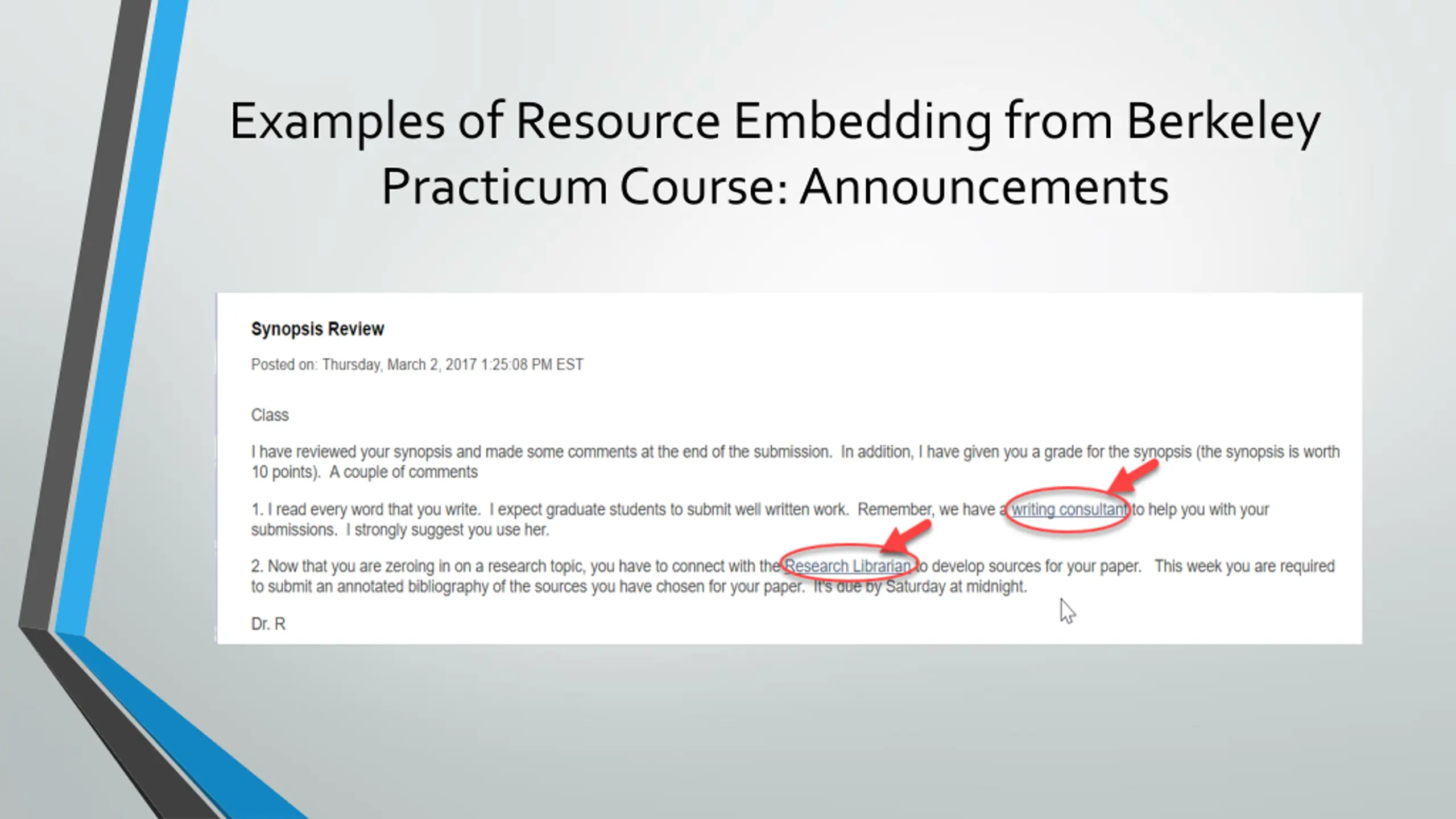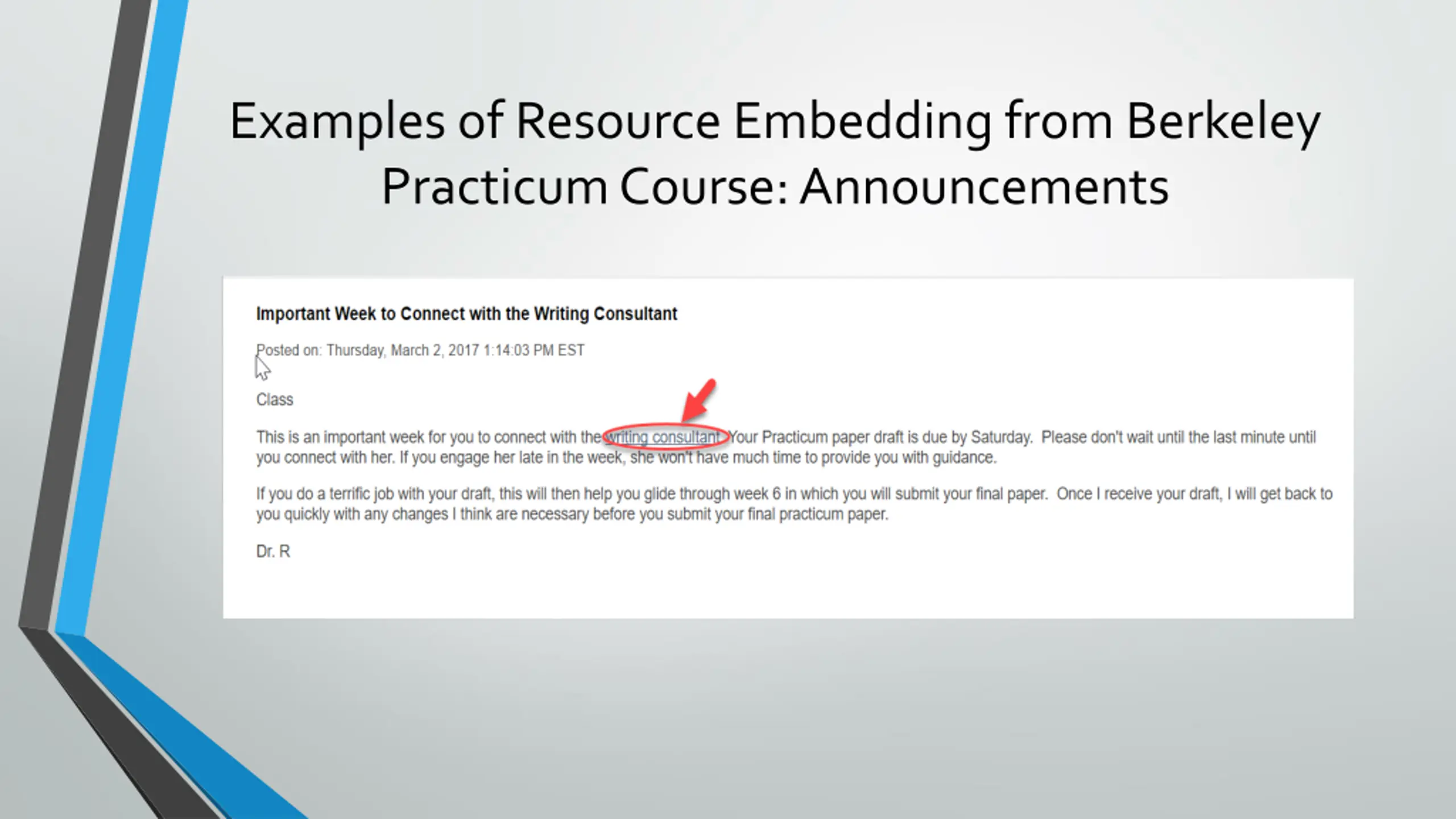 Examples of Resource Embedding from Berkeley Practicum Course: Announcements