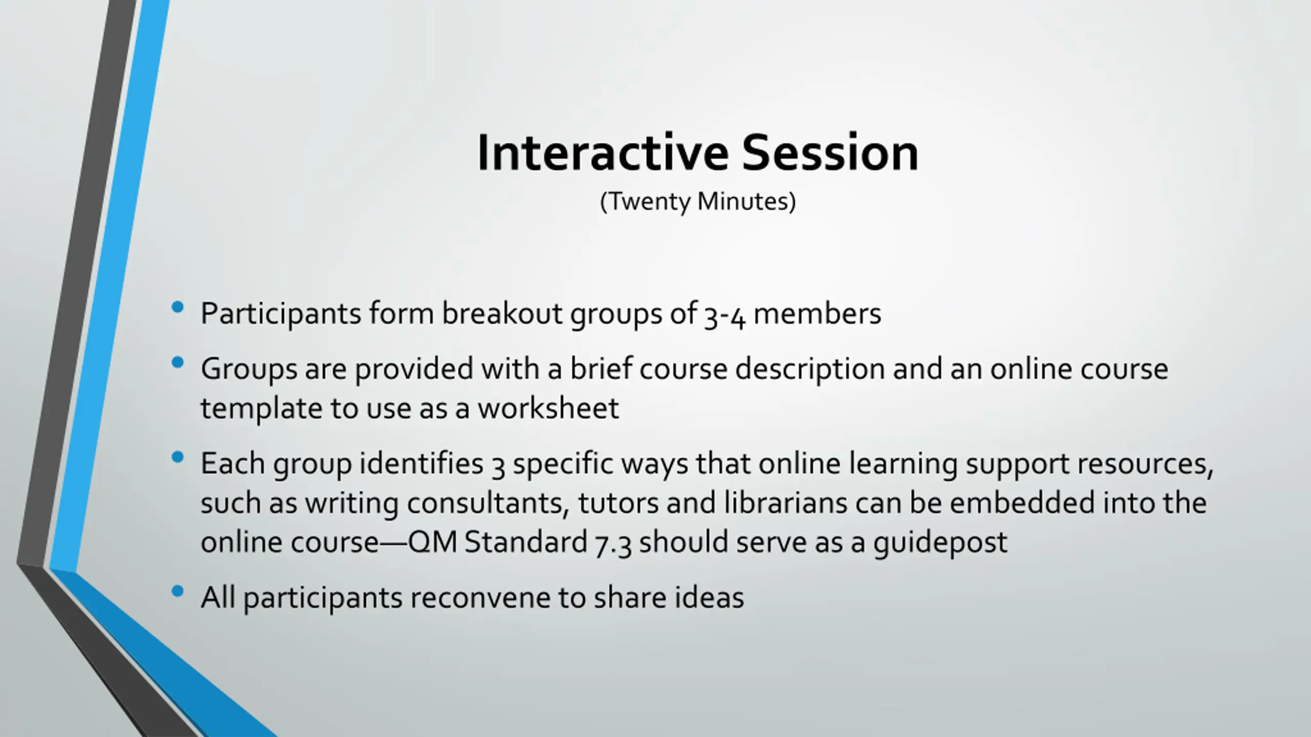 Interactive Session (Twenty Minutes) Participants form breakout groups of 3-4 members Groups are provided with a brief course description and an online course template to use as a worksheet Each group identifies 3 specific ways that online learning support resources, such as writing consultants, tutors and librarians can be embedded into the online course QM Standard 7.3 should serve as a guidepost All participants reconvene to share ideas