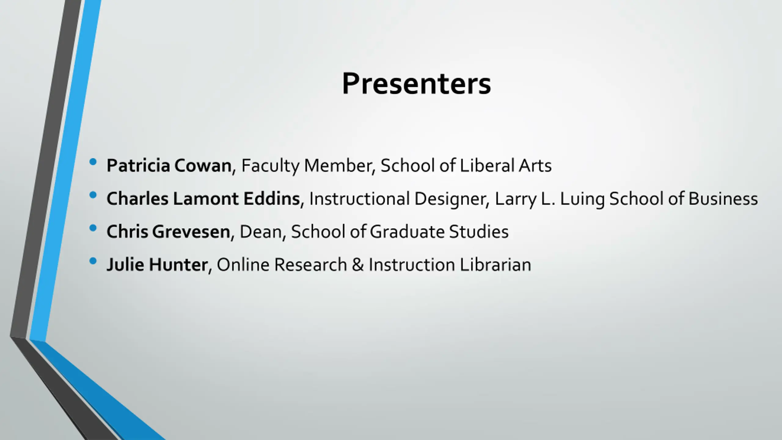 Presenters Patricia Cowan, Faculty Member, School of Liberal Arts Charles Lamont Eddins, Instructional Designer, Larry L. Luing School of Business Chris Grevesen, Dean, School of Graduate Studies Julie Hunter, Online Research & Instruction Librarian