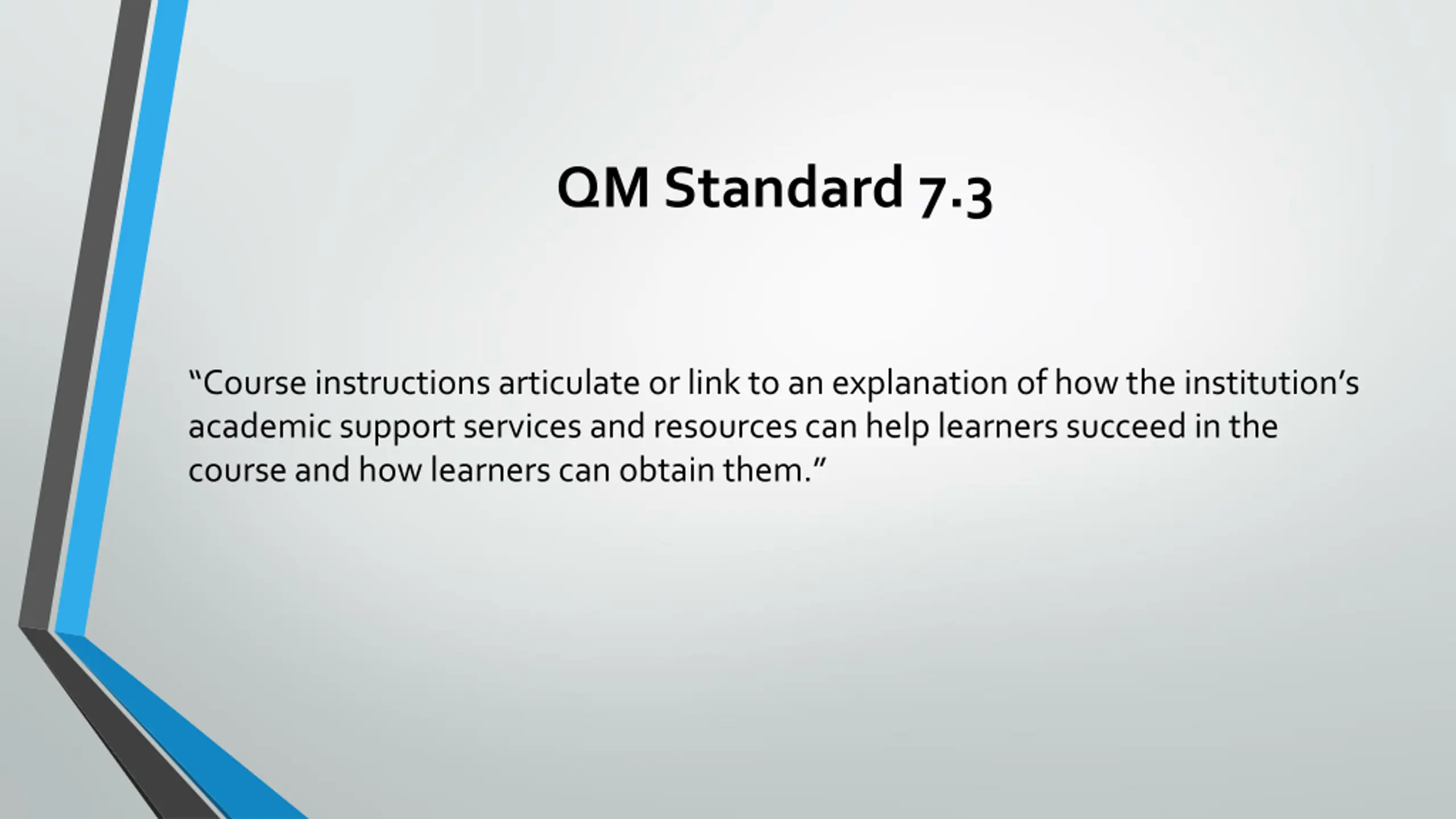 QM Standard 7.3 Course instructions articulate or link to an explanation of how the institution s academic support services and resources can help learners succeed in the course and how learners can obtain them.