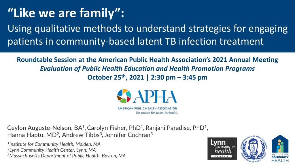 Like we are family: Using qualitative methods to understand strategies for engaging patients in community-based latent TB infection treatment Roundtable Session at the American Public Health Association s 2021 Annual Meeting Evaluation of Public Health Education and Health Promotion Programs October 25th, 2021 | 2:30 pm 3:45 pm Ceylon Auguste-Nelson, BA1,Carolyn Fisher, PhD1,Ranjani Paradise, PhD1, Hanna Haptu, MD2, Andrew Tibbs3,Jennifer Cochran3 1Institute for Community Health, Malden, MA 2Lynn Community Health Center, Lynn, MA 3Massachusetts Department of Public Health, Boston, MA