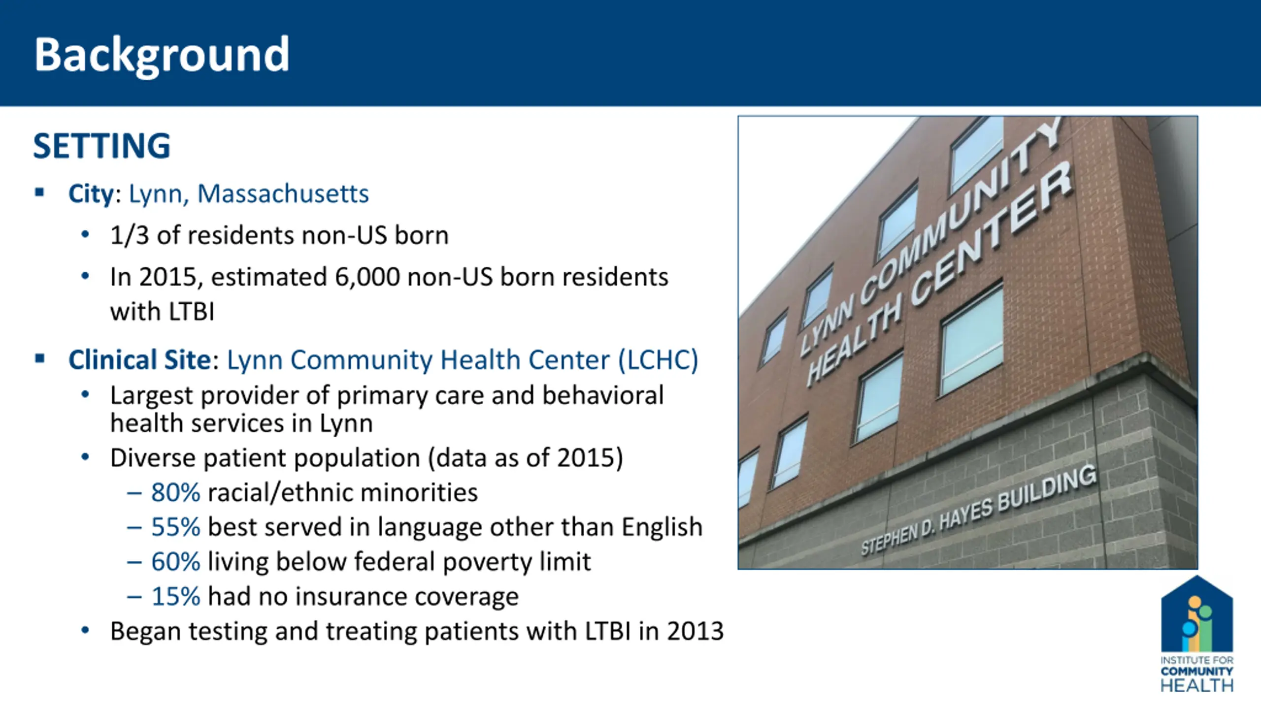 Background SETTING City: Lynn, Massachusetts 1/3 of residents non-US born In 2015, estimated 6,000 non-US born residents with LTBI Clinical Site: Lynn Community Health Center (LCHC) Largest provider of primary care and behavioral health services in Lynn Diverse patient population (data as of 2015) 80% racial/ethnic minorities 55% best served in language other than English 60% living below federal poverty limit 15% had no insurance coverage Began testing and treating patients with LTBI in 2013