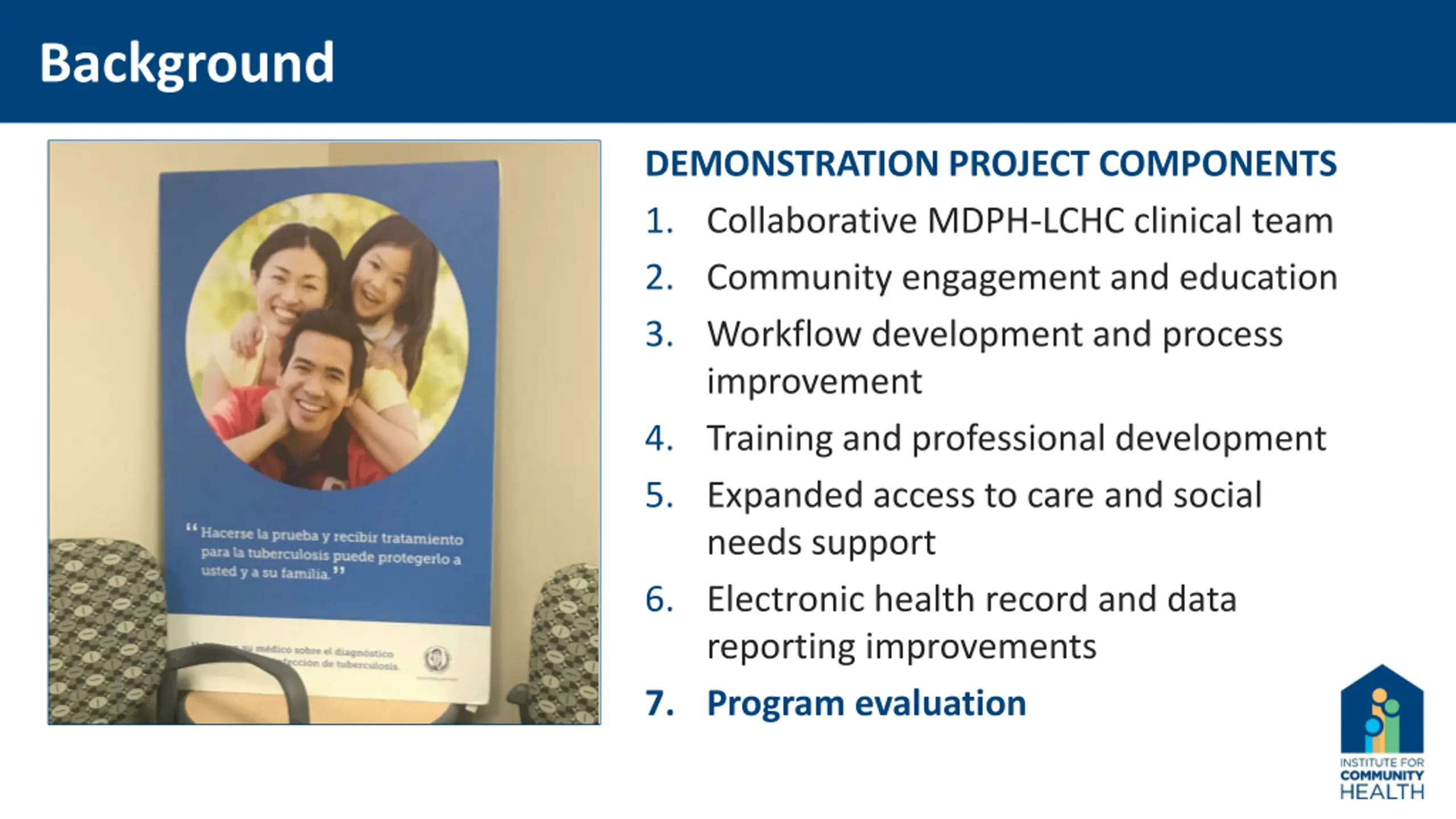 Background DEMONSTRATION PROJECT COMPONENTS 1. Collaborative MDPH-LCHC clinical team 2. Community engagement and education 3. Workflow development and process improvement 4. Training and professional development 5. Expanded access to care and social needs support 6. Electronic health record and data reporting improvements 7. Program evaluation