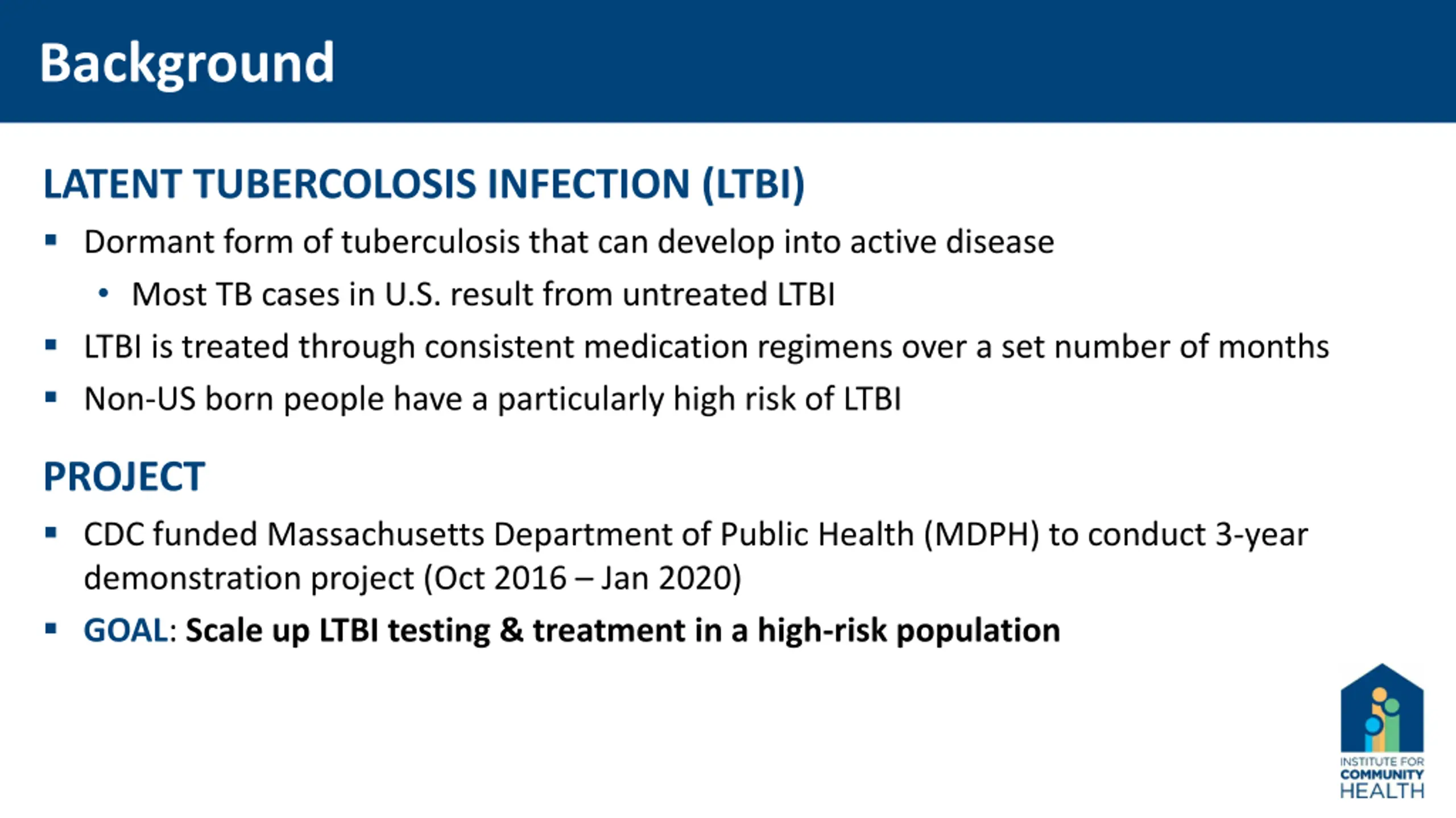 Background LATENT TUBERCOLOSIS INFECTION (LTBI) Dormant form of tuberculosis that can develop into active disease Most TB cases in U.S. result from untreated LTBI LTBI is treated through consistent medication regimens over a set number of months Non-US born people have a particularly high risk of LTBI PROJECT CDC funded Massachusetts Department of Public Health (MDPH) to conduct 3-year demonstration project (Oct 2016 Jan 2020) GOAL: Scale up LTBI testing & treatment in a high-risk population