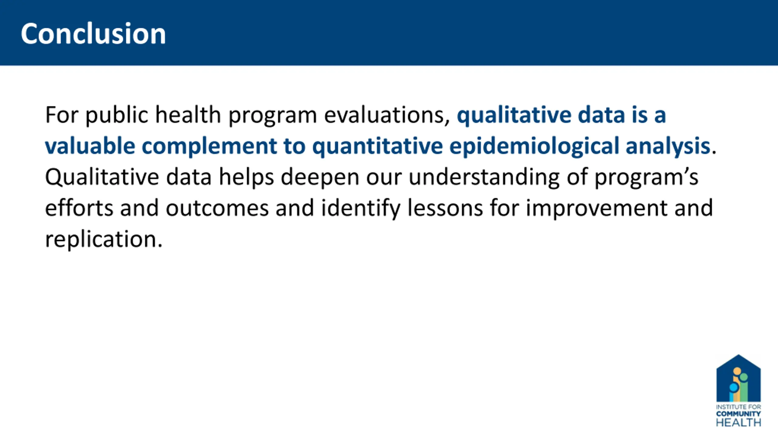 Conclusion For public health program evaluations, qualitative data is a valuable complement to quantitative epidemiological analysis. Qualitative data helps deepen our understanding of program s efforts and outcomes and identify lessons for improvement and replication.
