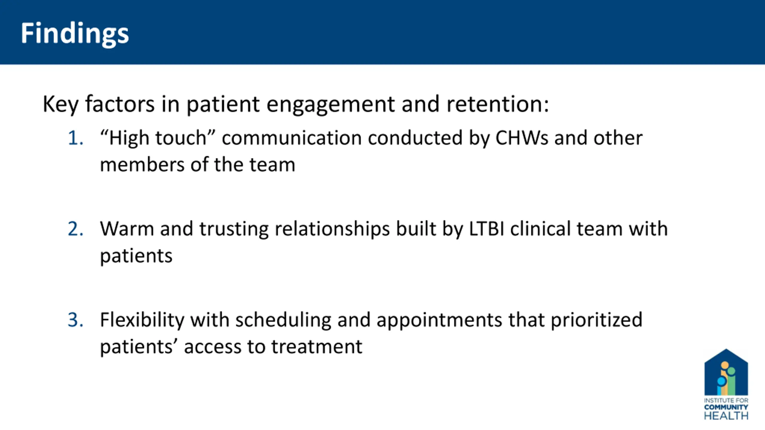 Findings Key factors in patient engagement and retention: 1. High touch communication conducted by CHWs and other members of the team 2. Warm and trusting relationships built by LTBI clinical team with patients 3. Flexibility with scheduling and appointments that prioritized patients access to treatment