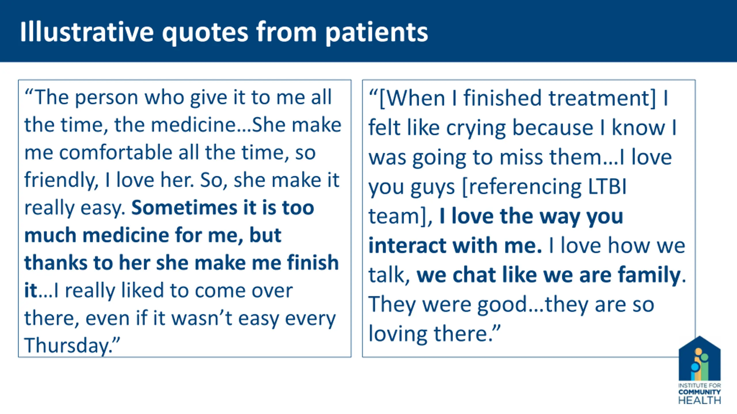 Illustrative quotes from patients The person who give it to me all the time, the medicine She make me comfortable all the time, so friendly, I love her. So, she make it really easy. Sometimes it is too much medicine for me, but thanks to her she make me finish it I really liked to come over there, even if it wasn t easy every Thursday. [When I finished treatment] I felt like crying because I know I was going to miss them I love you guys [referencing LTBI team], I love the way you interact with me. I love how we talk, we chat like we are family. They were good they are so loving there.