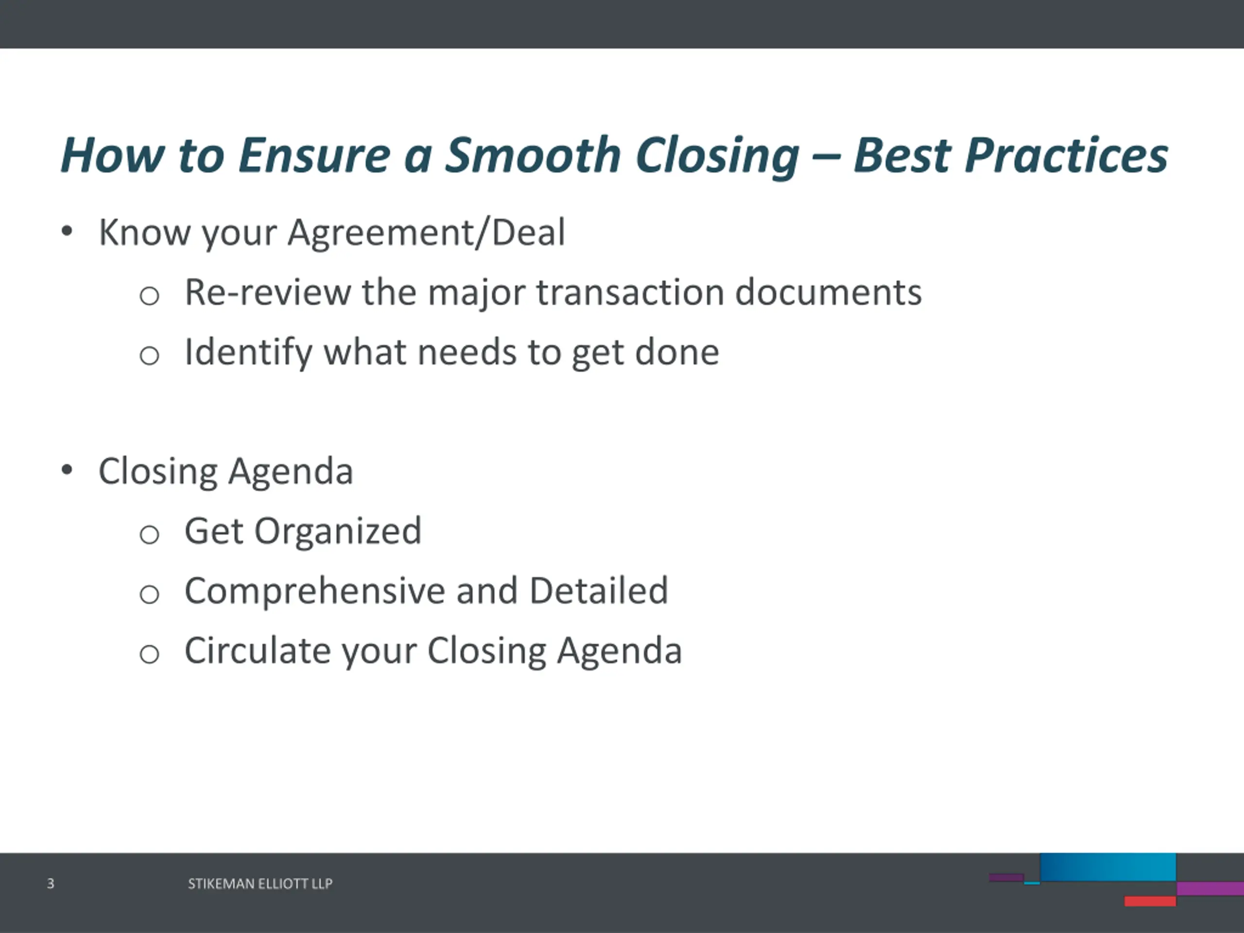 How to Ensure a Smooth Closing Specific Strategies o Know your Agreement/Deal o Closing Agenda o Third Party Deliverables o Closing Documentation o Communication o Post-closing Items 2 STIKEMAN ELLIOTT LLP