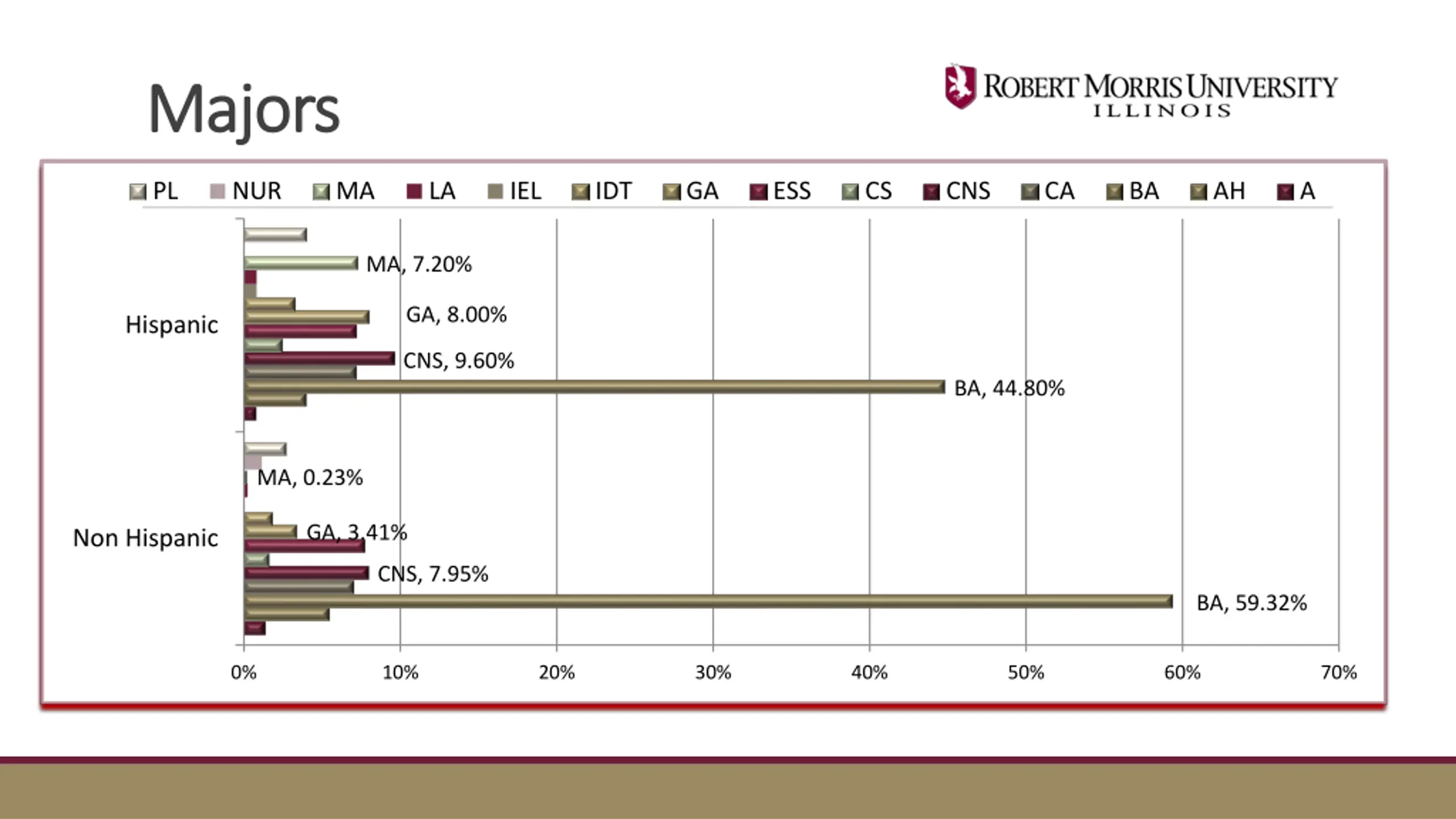 Majors Majors PL NUR MA LA IEL IDT GA ESS CS CNS CA BA AH A MA, 7.20% GA, 8.00% Hispanic CNS, 9.60% BA, 44.80% MA, 0.23% GA, 3.41% Non Hispanic CNS, 7.95% BA, 59.32% 0% 10% 20% 30% 40% 50% 60% 70%
