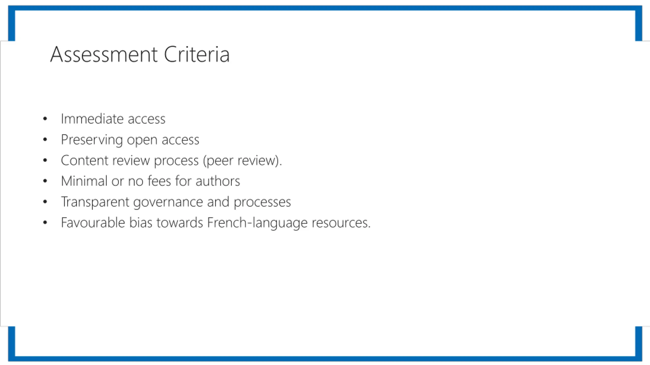 Assessment Criteria Immediate access Preserving open access Content review process (peer review). Minimal or no fees for authors Transparent governance and processes Favourable bias towards French-language resources.