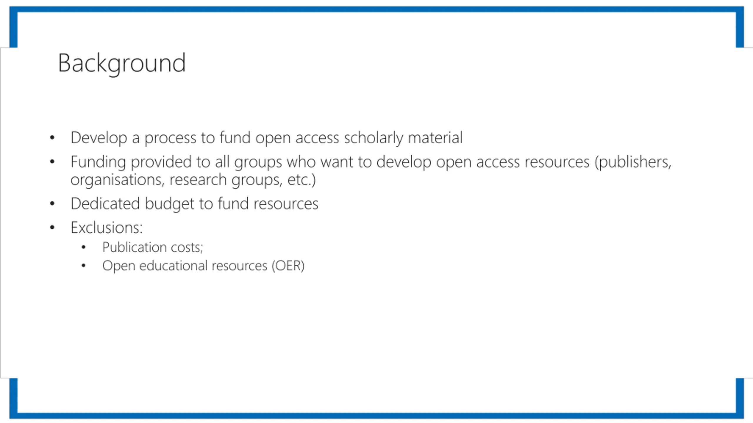 Background Develop a process to fund open access scholarly material Funding provided to all groups who want to develop open access resources (publishers, organisations, research groups, etc.) Dedicated budget to fund resources Exclusions: Publication costs; Open educational resources (OER)