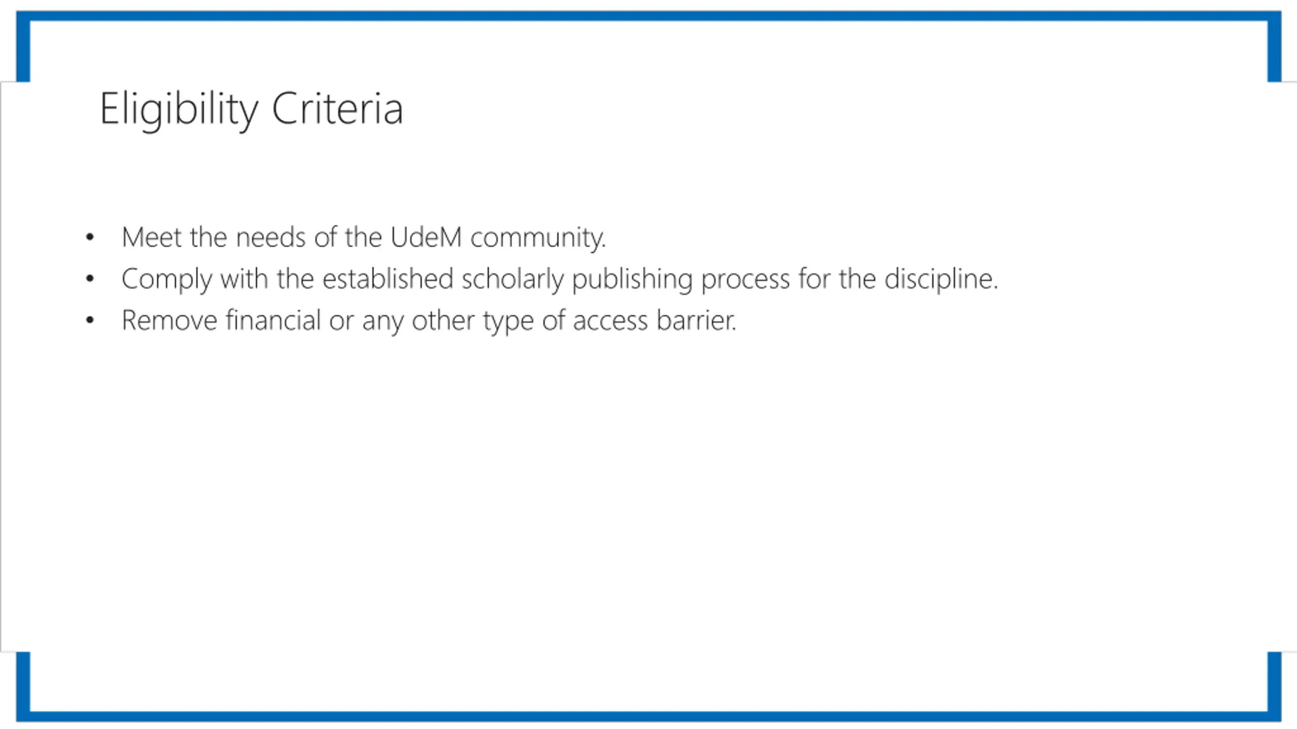 Eligibility Criteria Meet the needs of the UdeM community. Comply with the established scholarly publishing process for the discipline. Remove financial or any other type of access barrier.