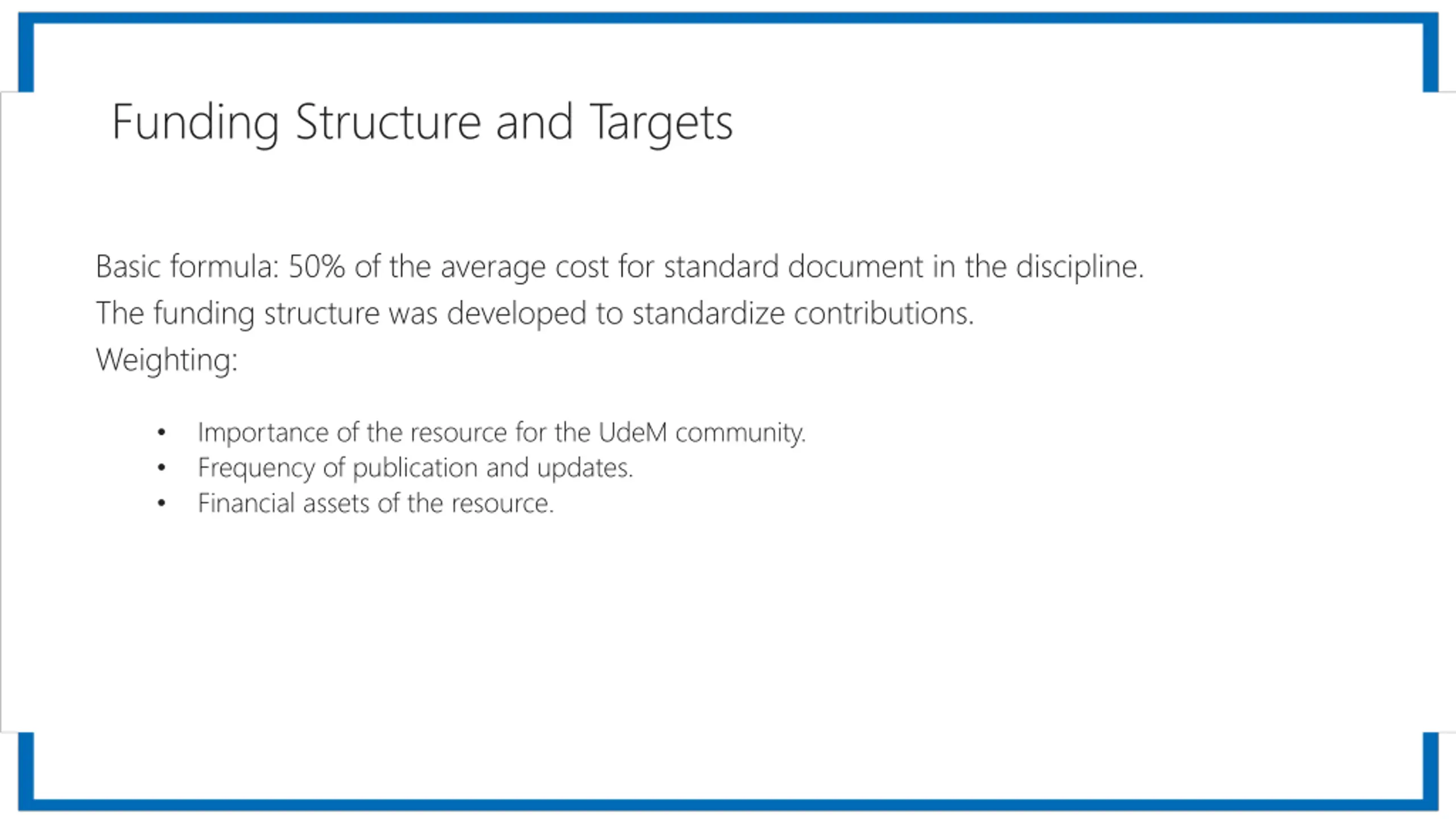 Funding Structure and Targets Basic formula: 50% of the average cost for standard document in the discipline. The funding structure was developed to standardize contributions. Weighting: Importance of the resource for the UdeM community. Frequency of publication and updates. Financial assets of the resource.