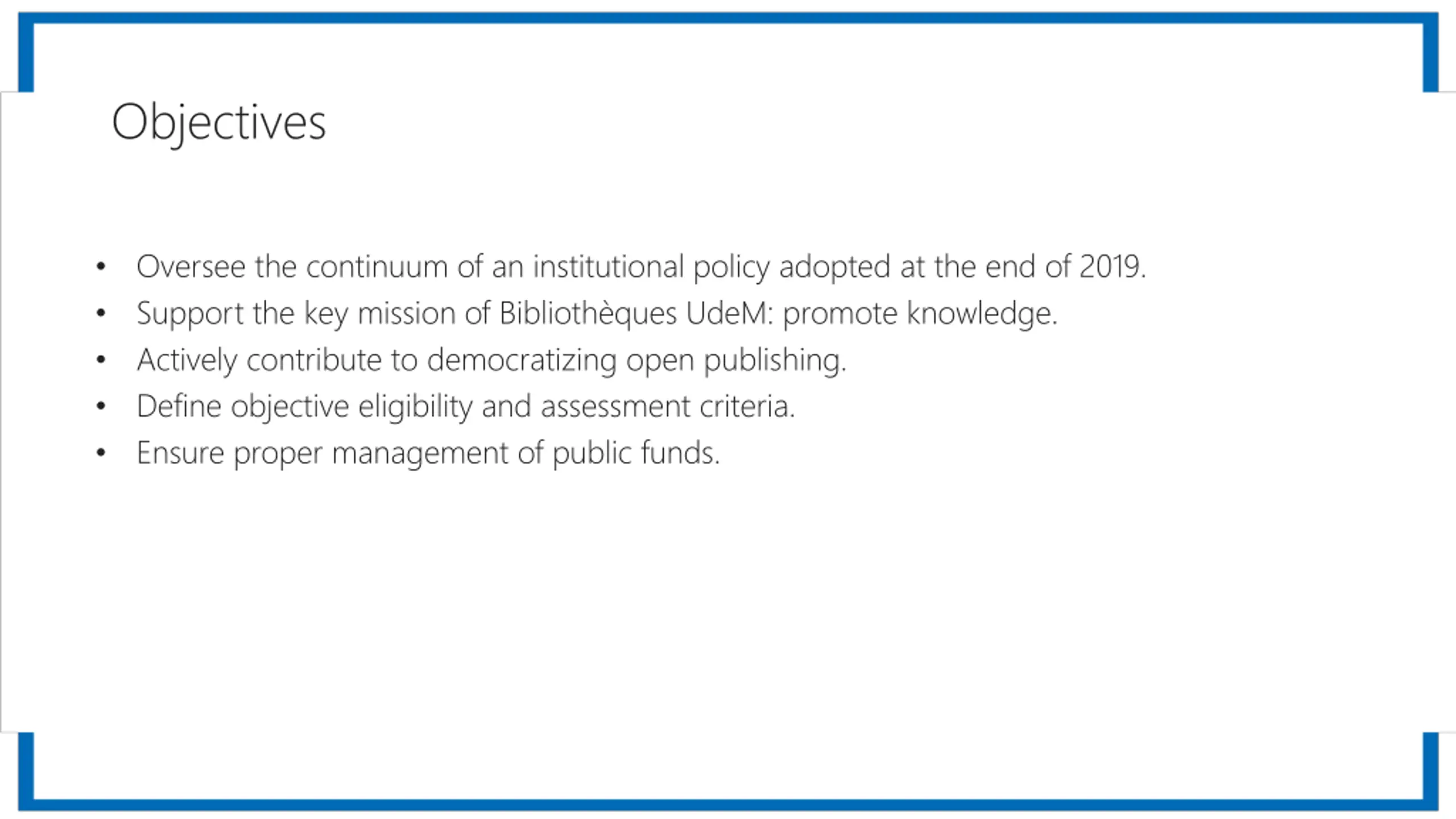 Objectives Oversee the continuum of an institutional policy adopted at the end of 2019. Support the key mission of Biblioth ques UdeM: promote knowledge. Actively contribute to democratizing open publishing. Define objective eligibility and assessment criteria. Ensure proper management of public funds.