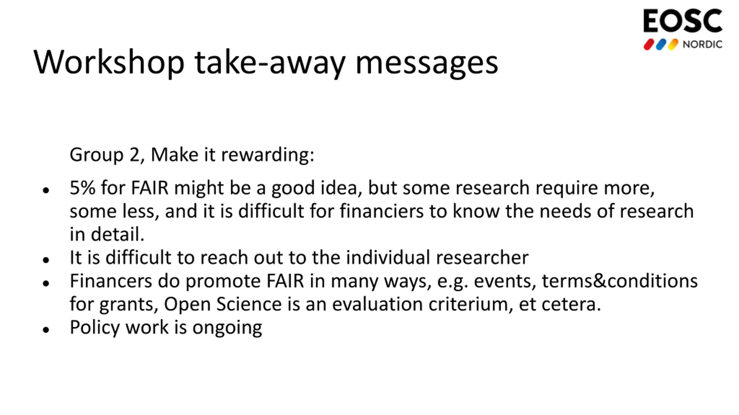 Workshop take-away messages Group 2, Make it rewarding: 5% for FAIR might be a good idea, but some research require more, some less, and it is difficult for financiers to know the needs of research in detail. It is difficult to reach out to the individual researcher Financers do promote FAIR in many ways, e.g. events, terms&conditions for grants, Open Science is an evaluation criterium, et cetera. Policy work is ongoing