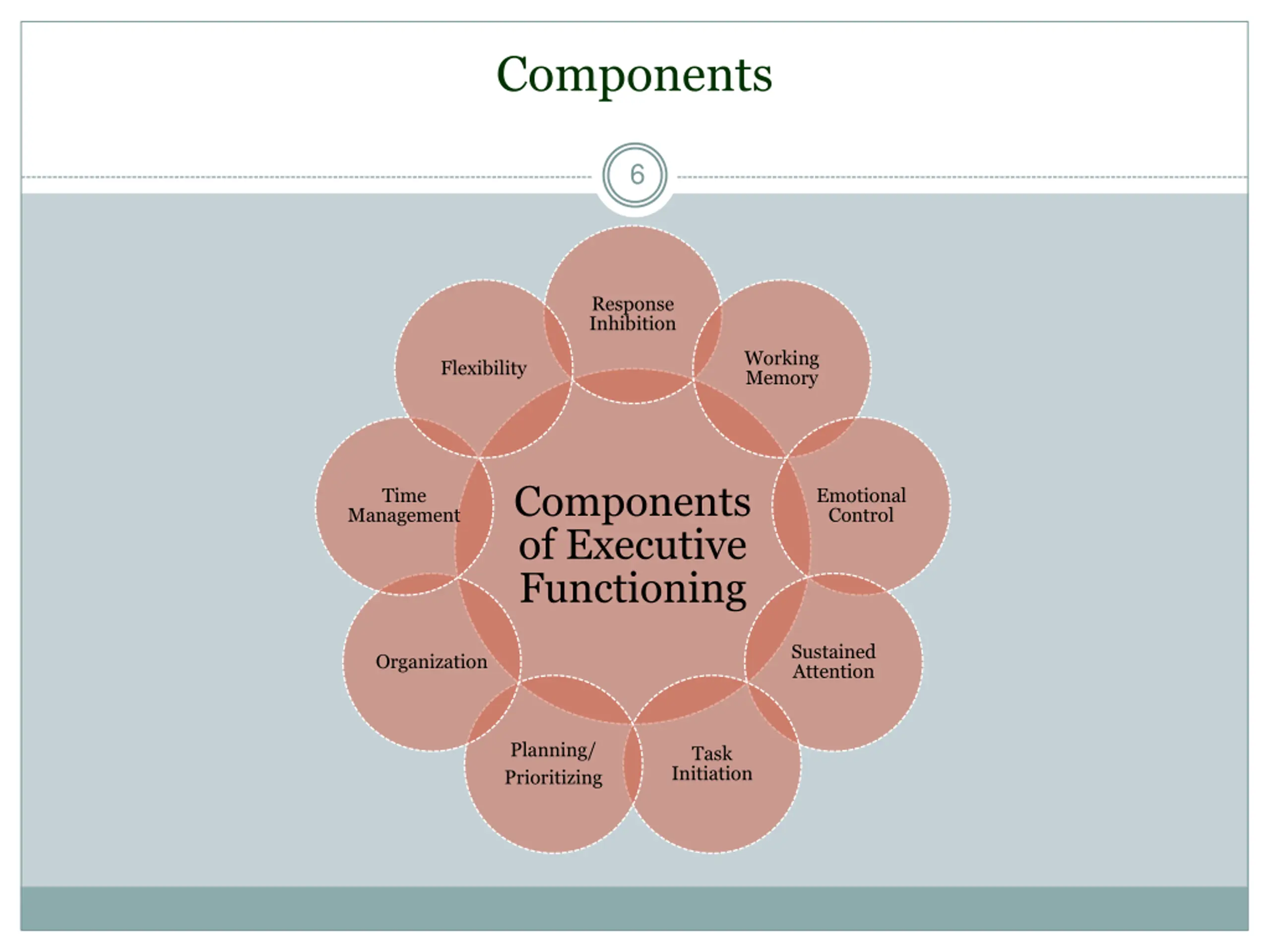 Components 6 Response Inhibition Working Memory Flexibility Components of Executive Functioning Time Emotional Control Management Sustained Attention Organization Planning/ Prioritizing Task Initiation