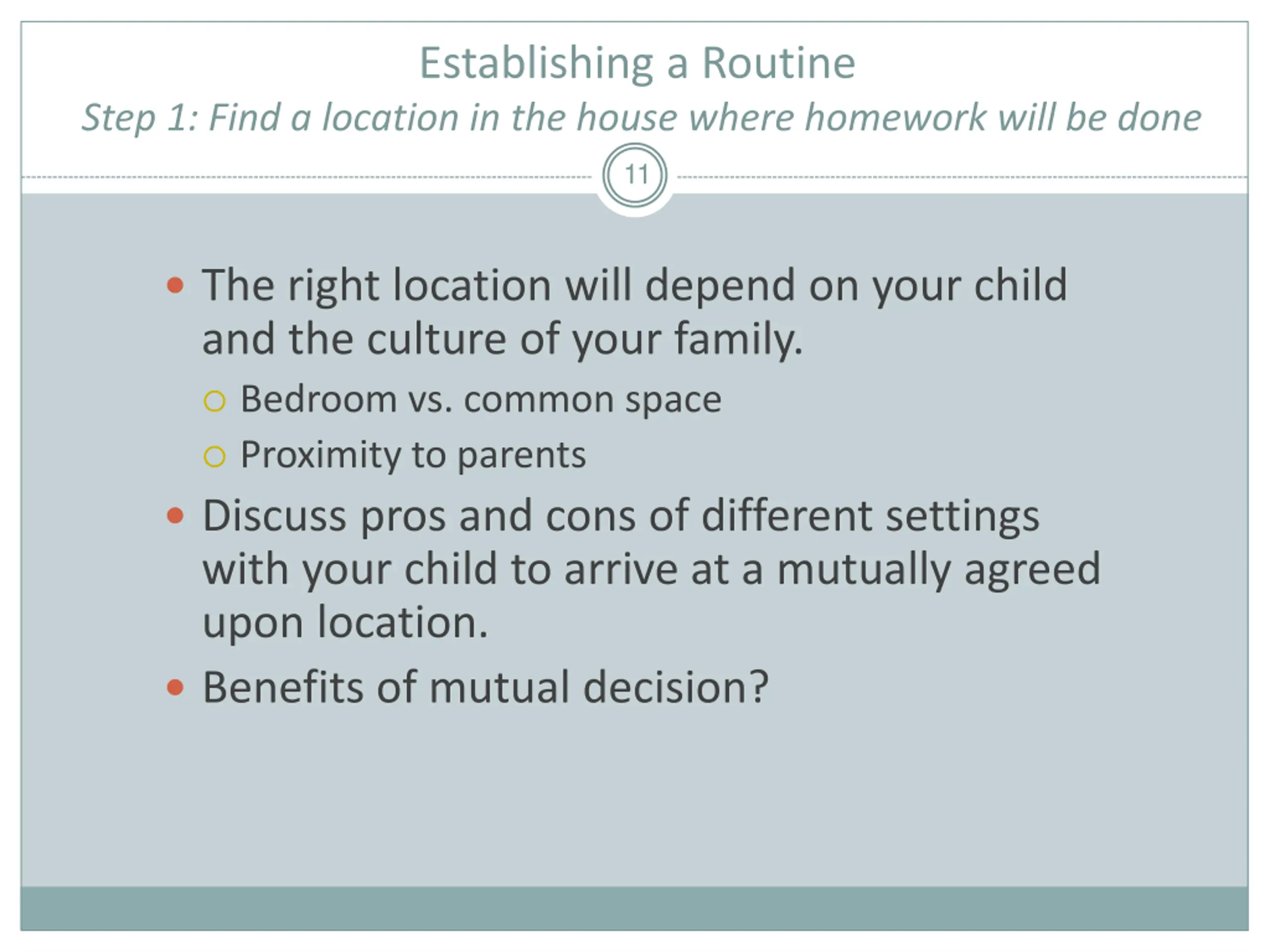 Establishing a Routine Step 1: Find a location in the house where homework will be done 11 The right location will depend on your child and the culture of your family. Bedroom vs. common space Proximity to parents Discuss pros and cons of different settings with your child to arrive at a mutually agreed upon location. Benefits of mutual decision?