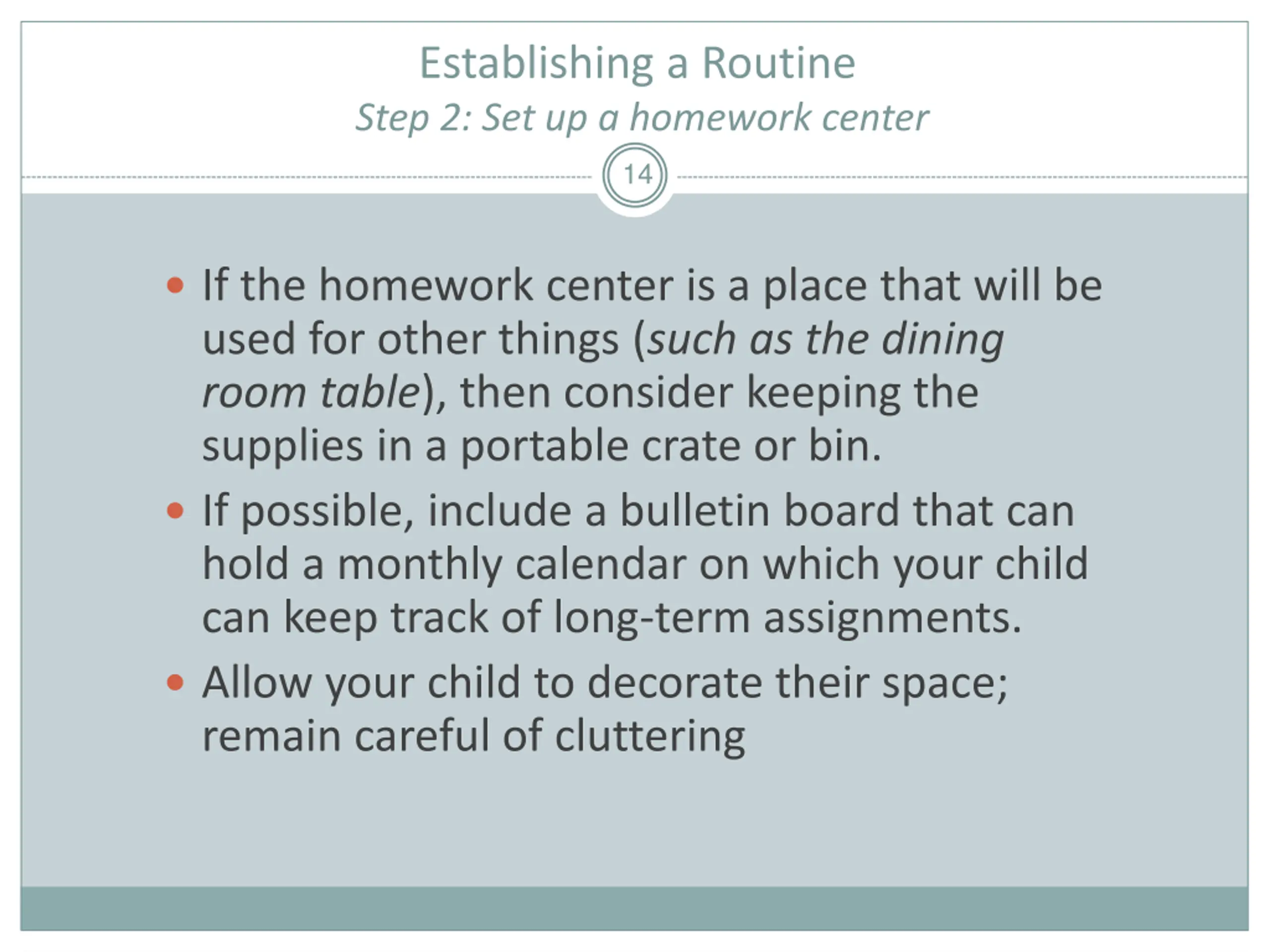Establishing a Routine Step 2: Set up a homework center 14 If the homework center is a place that will be used for other things (such as the dining room table), then consider keeping the supplies in a portable crate or bin. If possible, include a bulletin board that can hold a monthly calendar on which your child can keep track of long-term assignments. Allow your child to decorate their space; remain careful of cluttering
