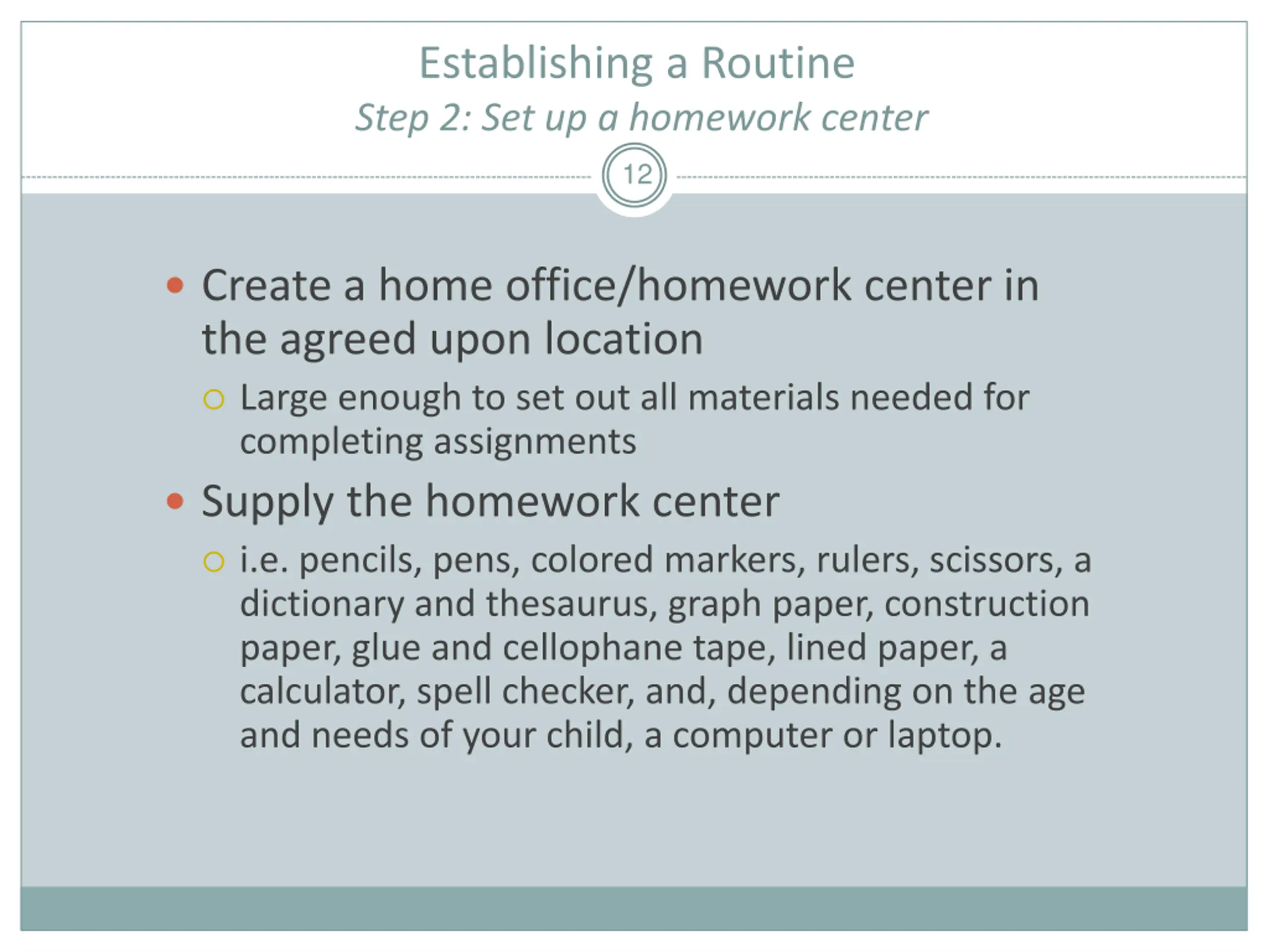 Establishing a Routine Step 2: Set up a homework center 12 Create a home office/homework center in the agreed upon location Large enough to set out all materials needed for completing assignments Supply the homework center i.e. pencils, pens, colored markers, rulers, scissors, a dictionary and thesaurus, graph paper, construction paper, glue and cellophane tape, lined paper, a calculator, spell checker, and, depending on the age and needs of your child, a computer or laptop.