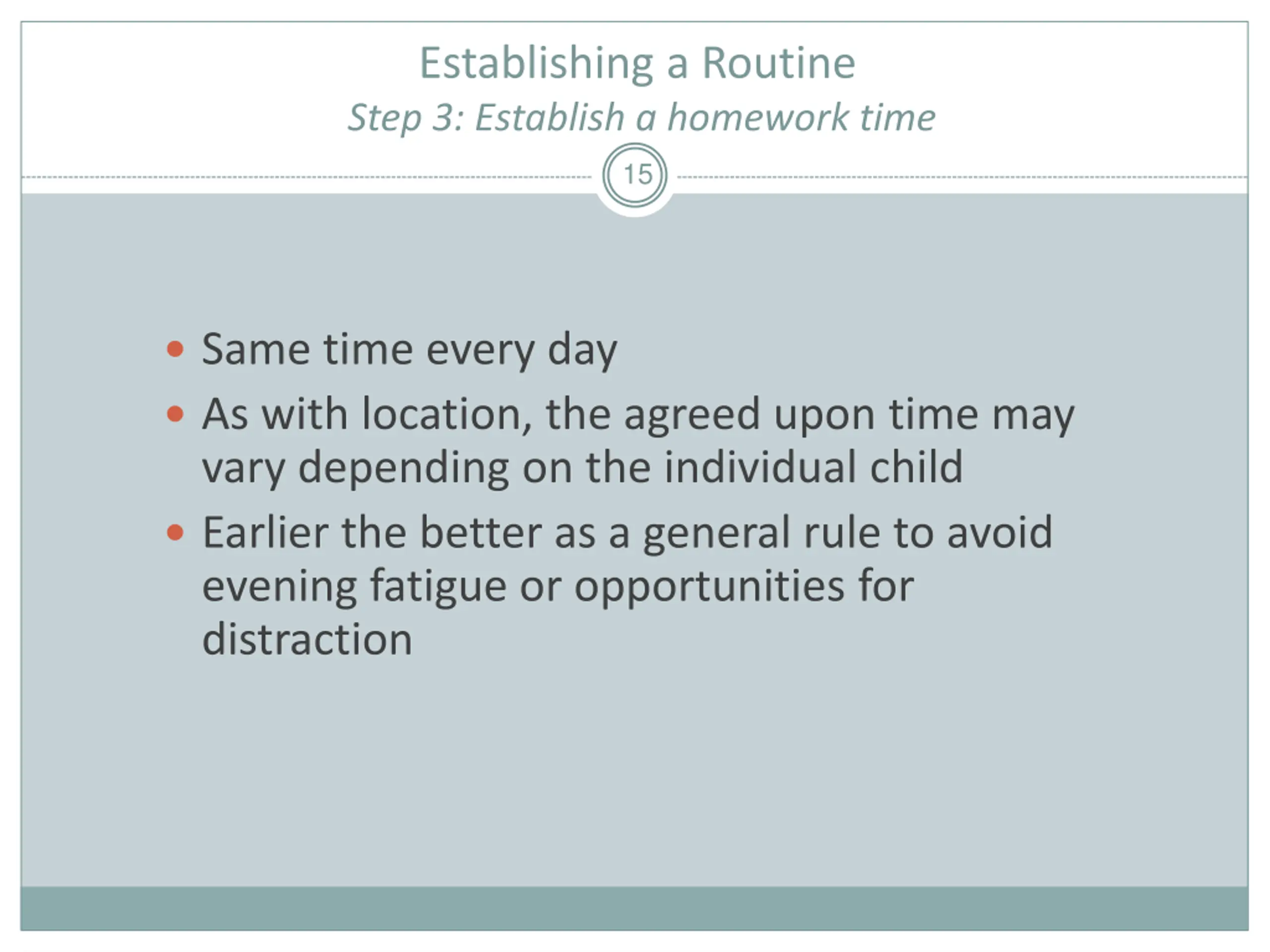 Establishing a Routine Step 3: Establish a homework time 15 Same time every day As with location, the agreed upon time may vary depending on the individual child Earlier the better as a general rule to avoid evening fatigue or opportunities for distraction