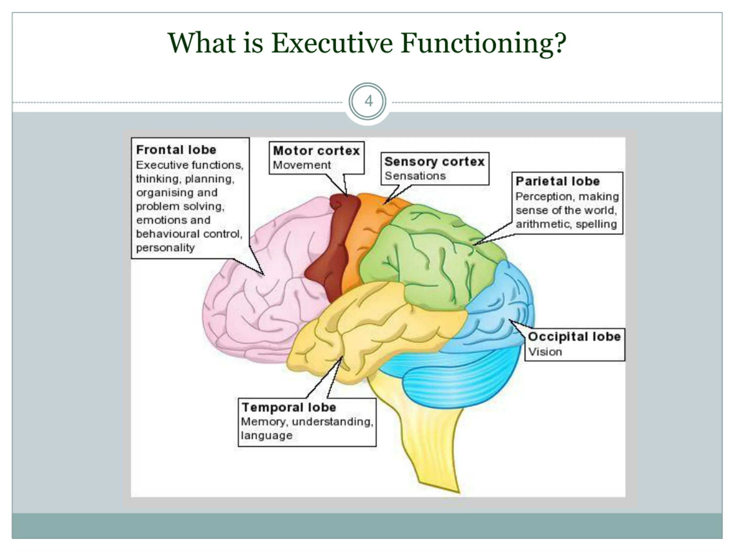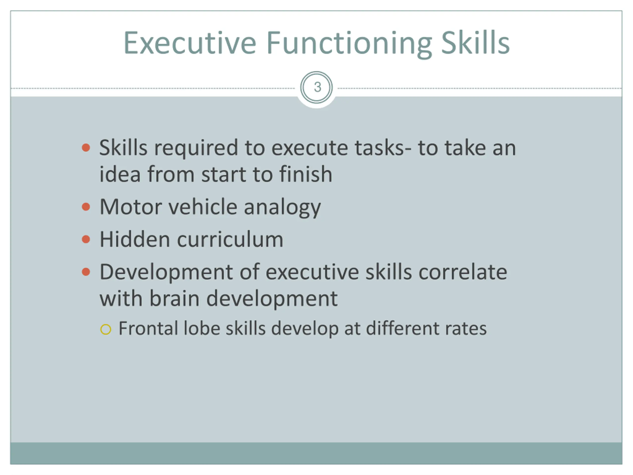 Executive Functioning Skills 3 Skills required to execute tasks- to take an idea from start to finish Motor vehicle analogy Hidden curriculum Development of executive skills correlate with brain development Frontal lobe skills develop at different rates