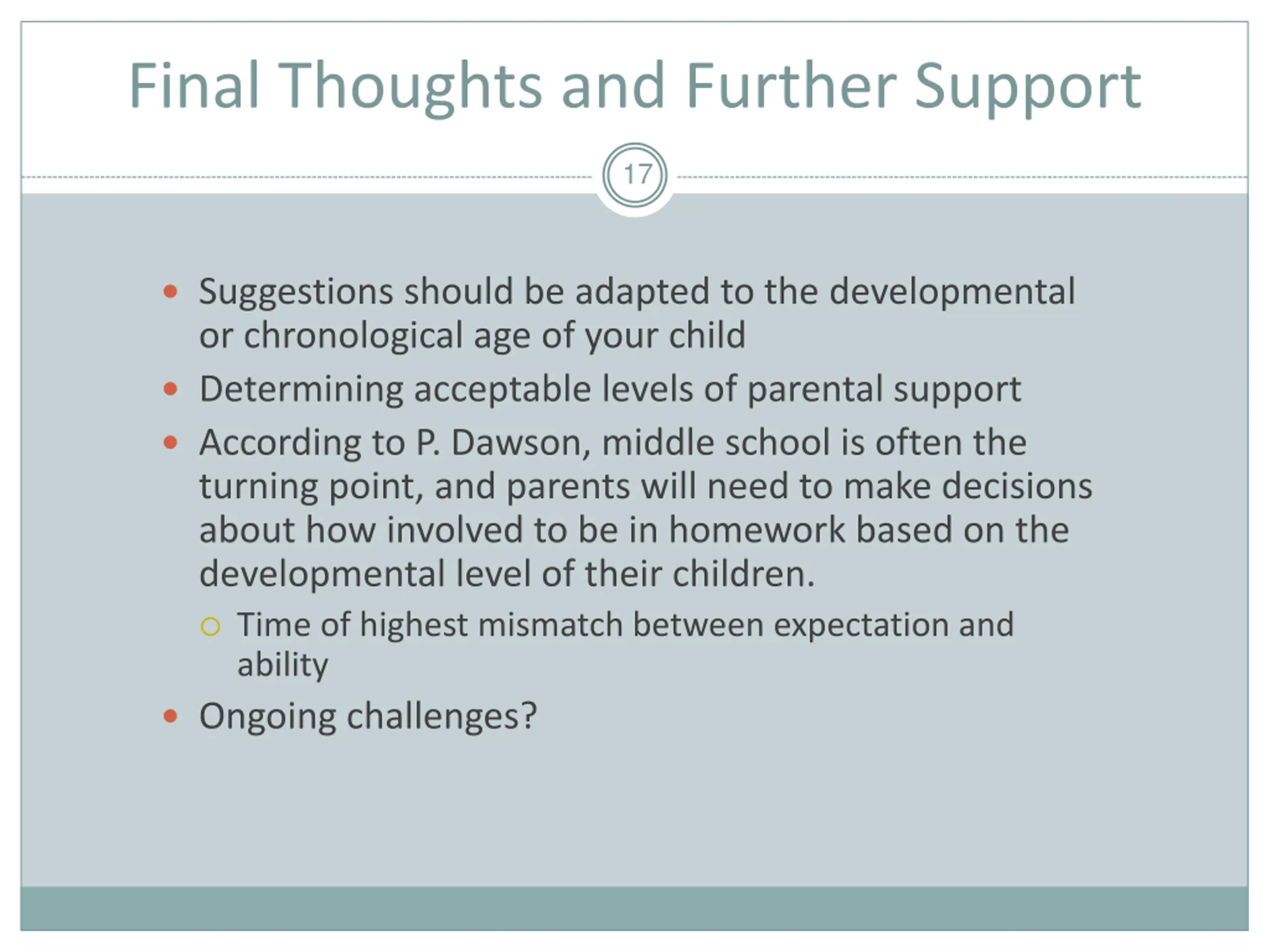 Final Thoughts and Further Support 17 Suggestions should be adapted to the developmental or chronological age of your child Determining acceptable levels of parental support According to P. Dawson, middle school is often the turning point, and parents will need to make decisions about how involved to be in homework based on the developmental level of their children. Time of highest mismatch between expectation and ability Ongoing challenges?